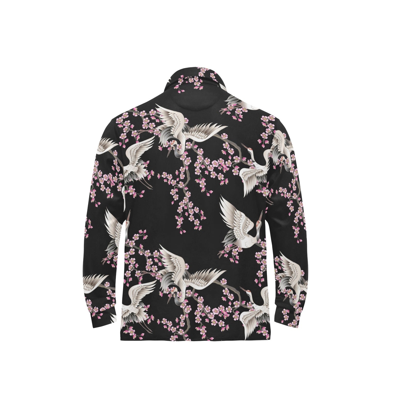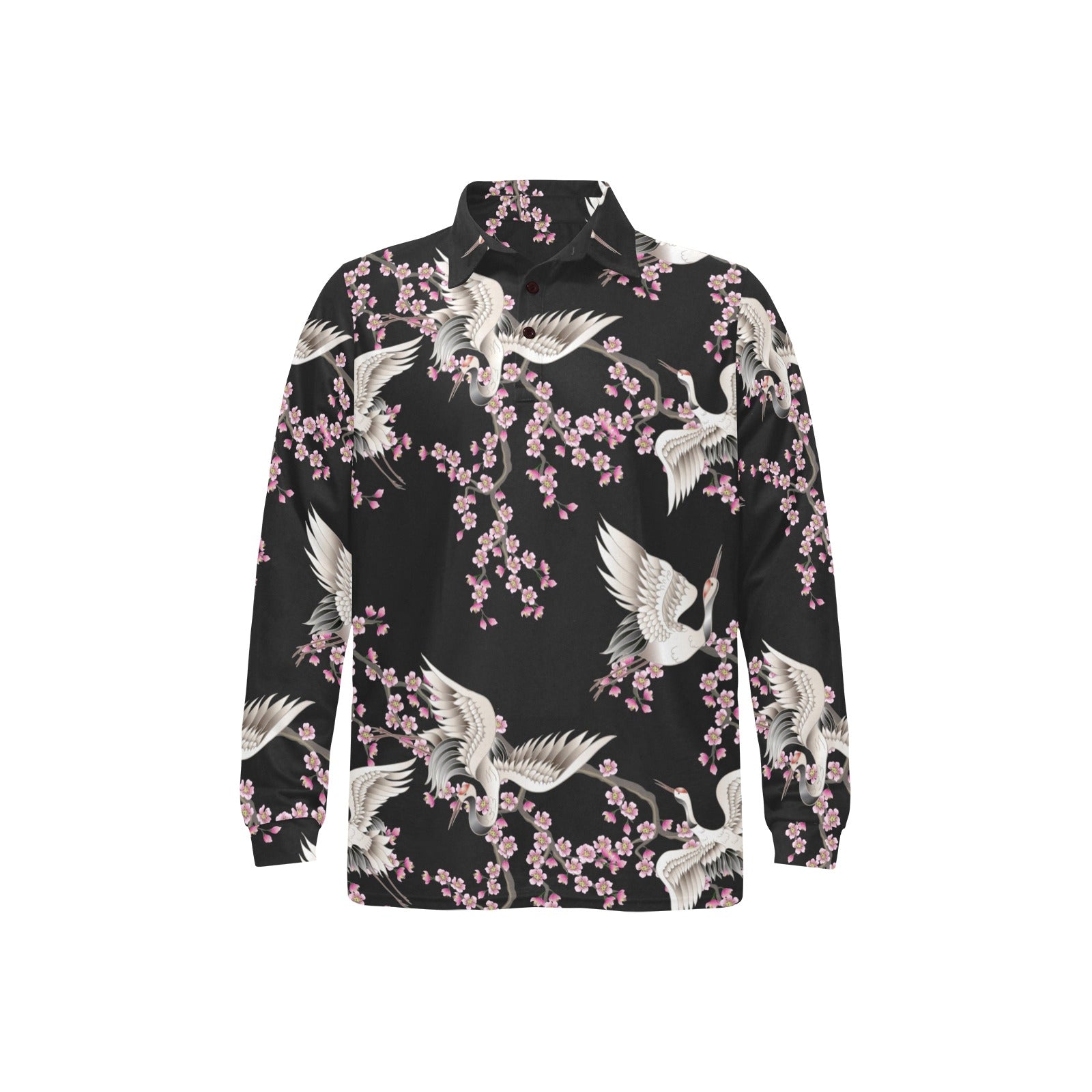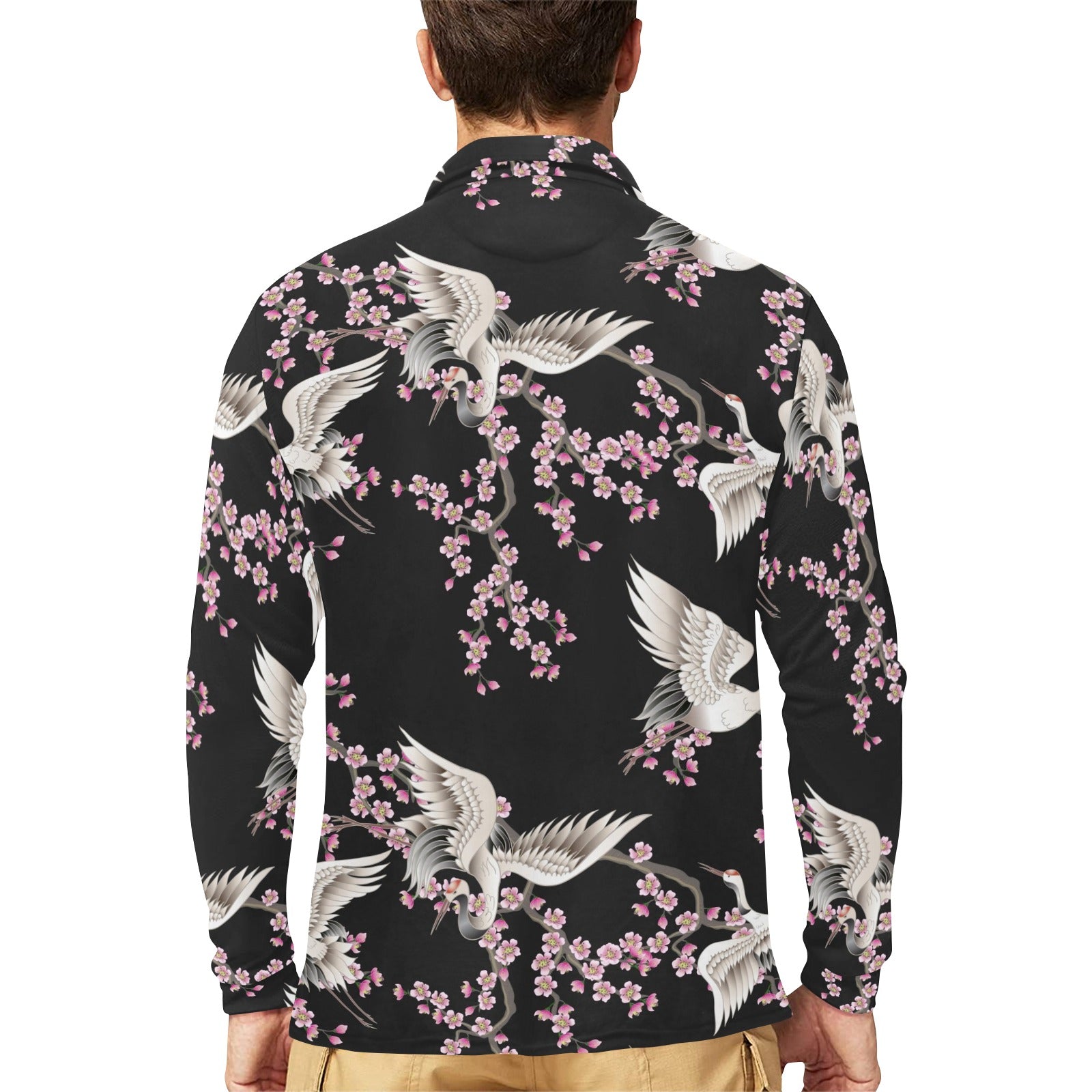 Japanese crane pink sakura pattern Men's Long Sleeve Polo Shirt
