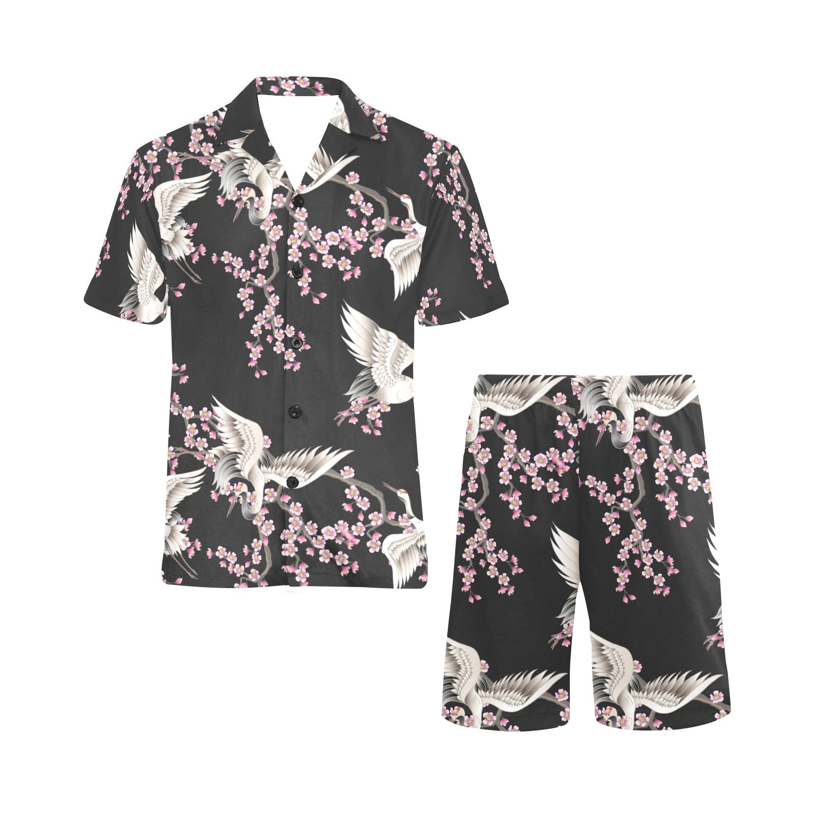 Japanese crane pink sakura pattern Men's V-Neck Short Pajama Set