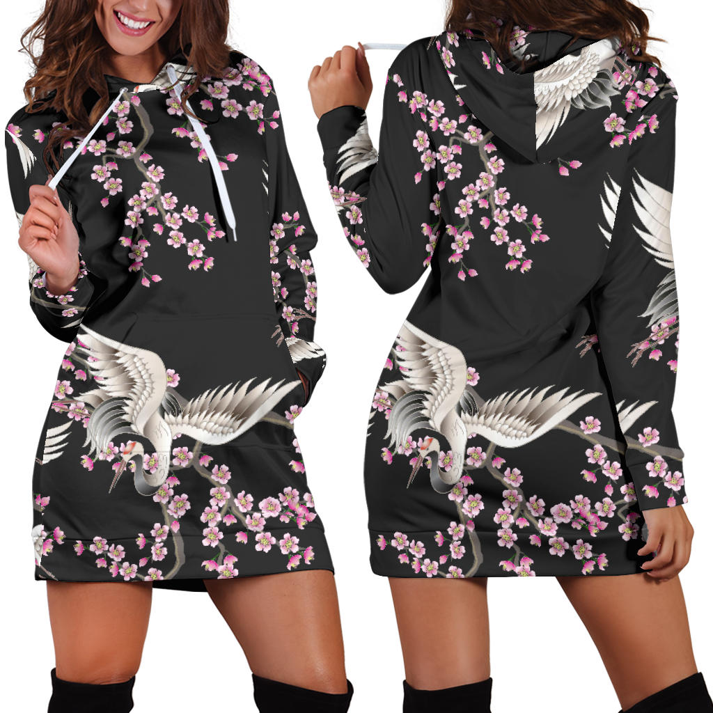 Japanese Crane Pink Sakura Pattern Women'S Hoodie Dress