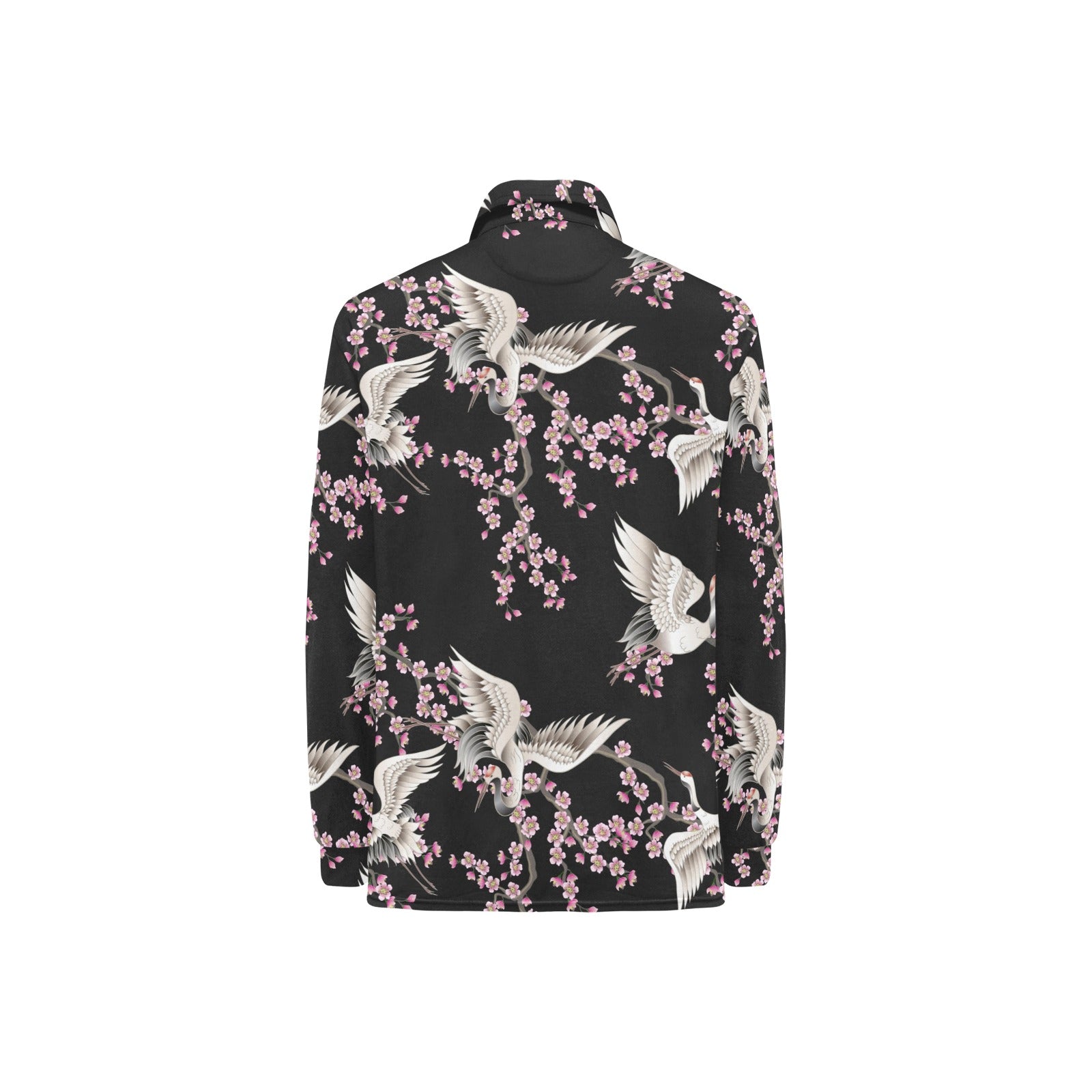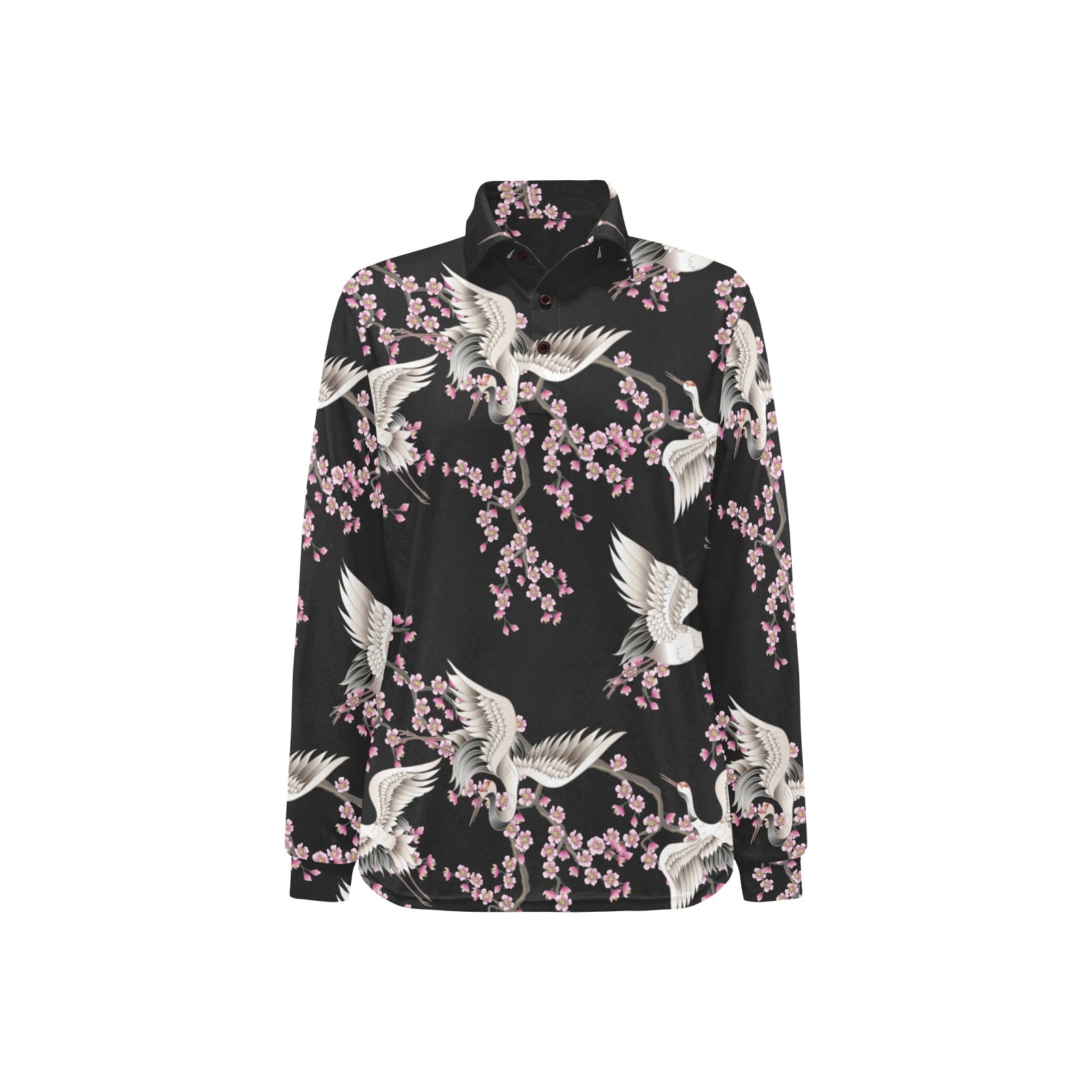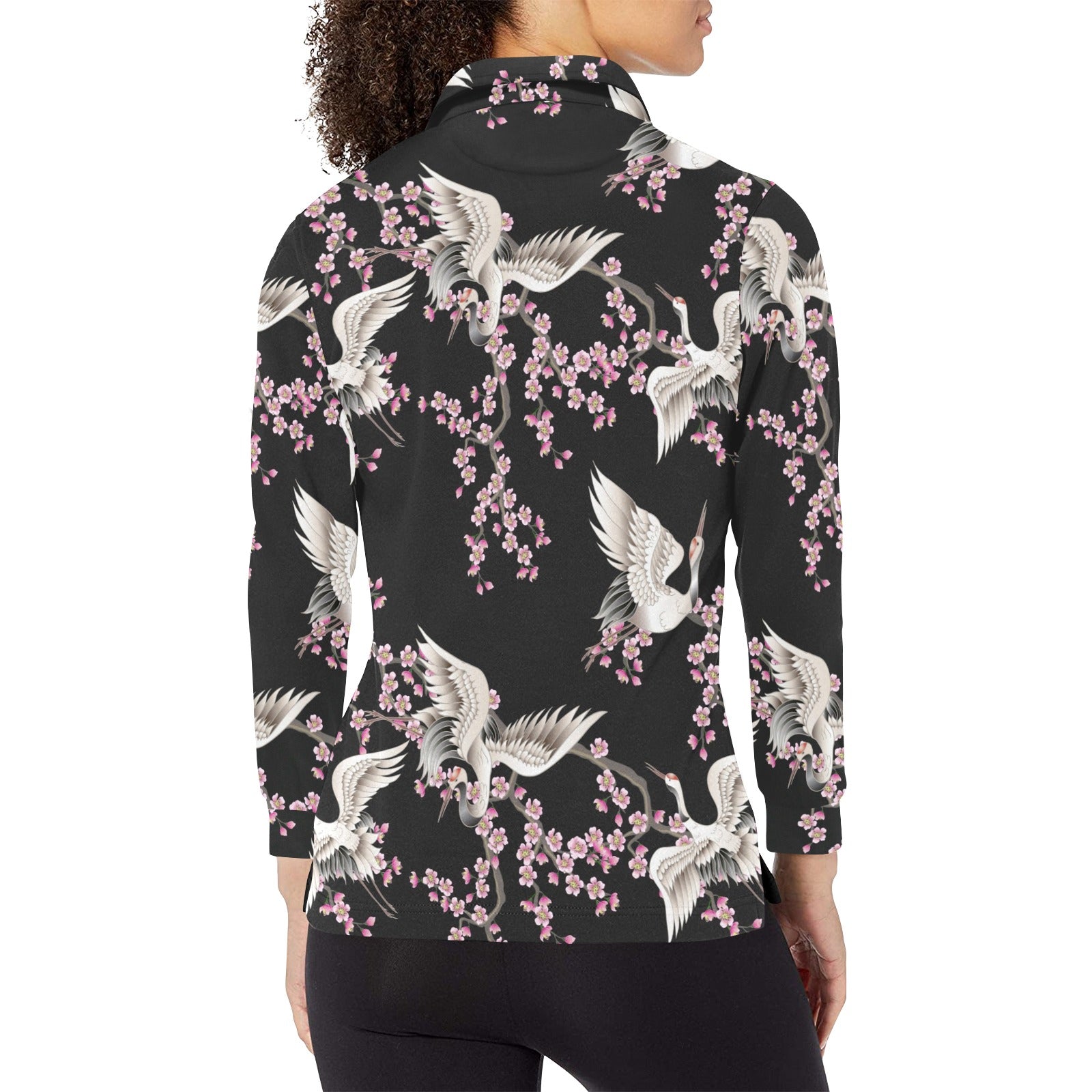 Japanese crane pink sakura pattern Women's Long Sleeve Polo Shirt