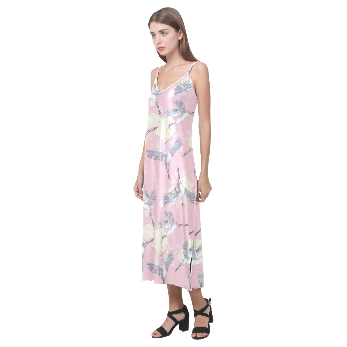 Japanese crane rose pattern V-Neck Open Fork Long Dress is a uniqued design and limited item. It made to order, hand printed, and sewn with love in our factory.