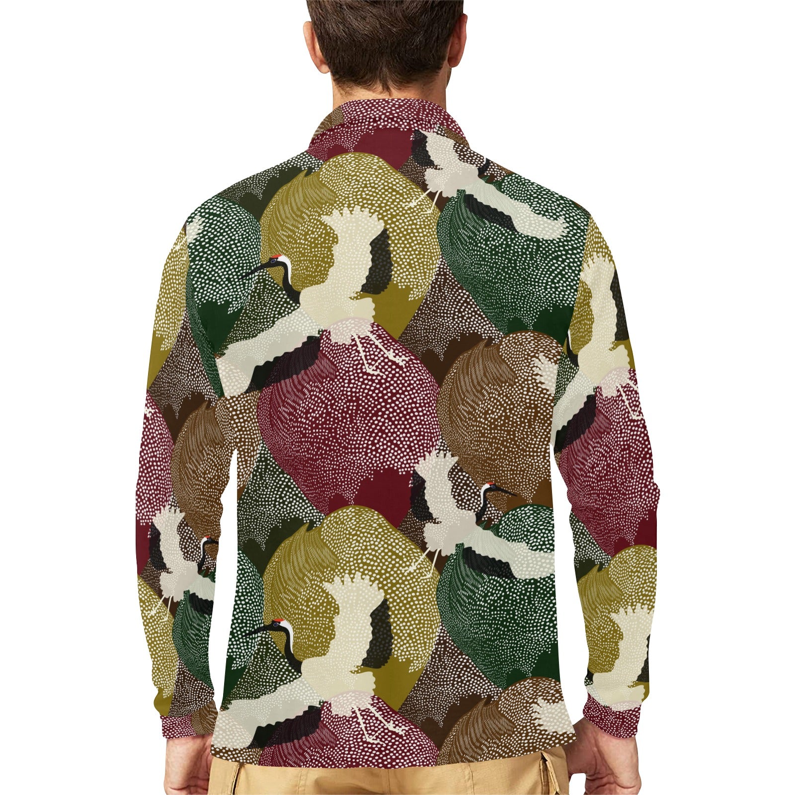 Japanese cranes flying forest dot pattern Men's Long Sleeve Polo Shirt