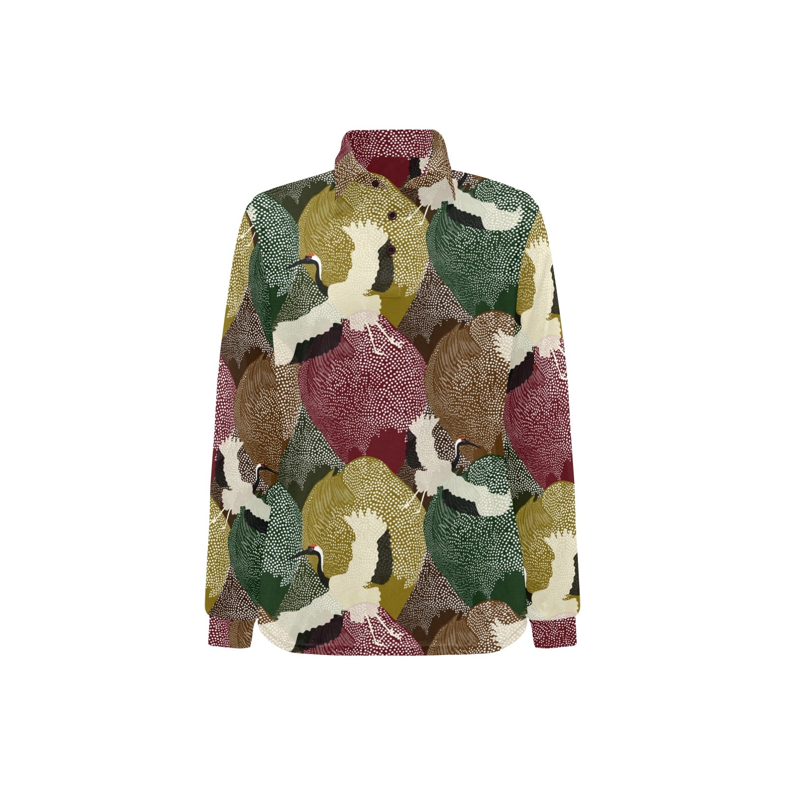 Japanese cranes flying forest dot pattern Women's Long Sleeve Polo Shirt