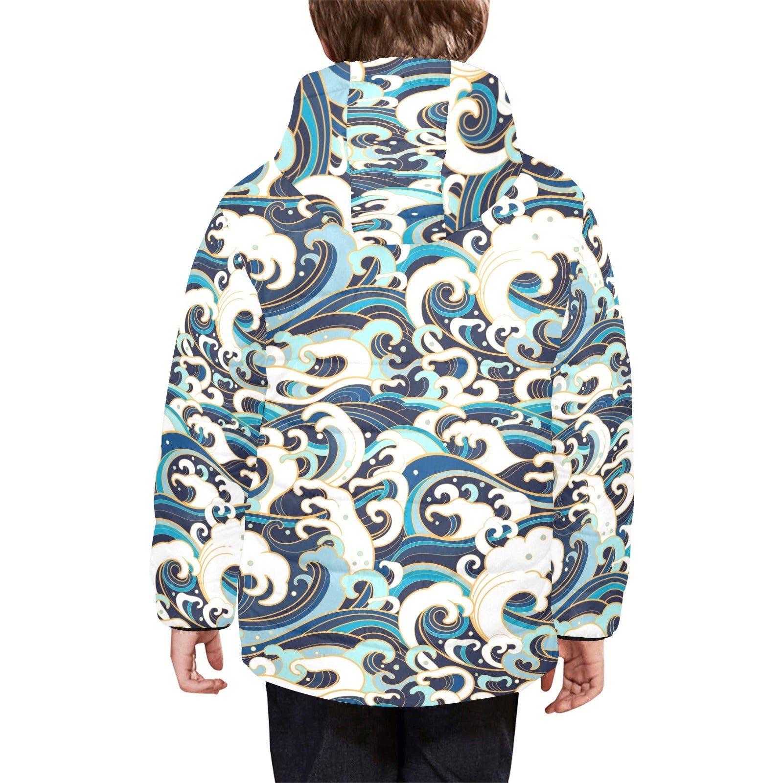Japanese wave pattern Kids' Boys' Girls' Padded Hooded Jacket