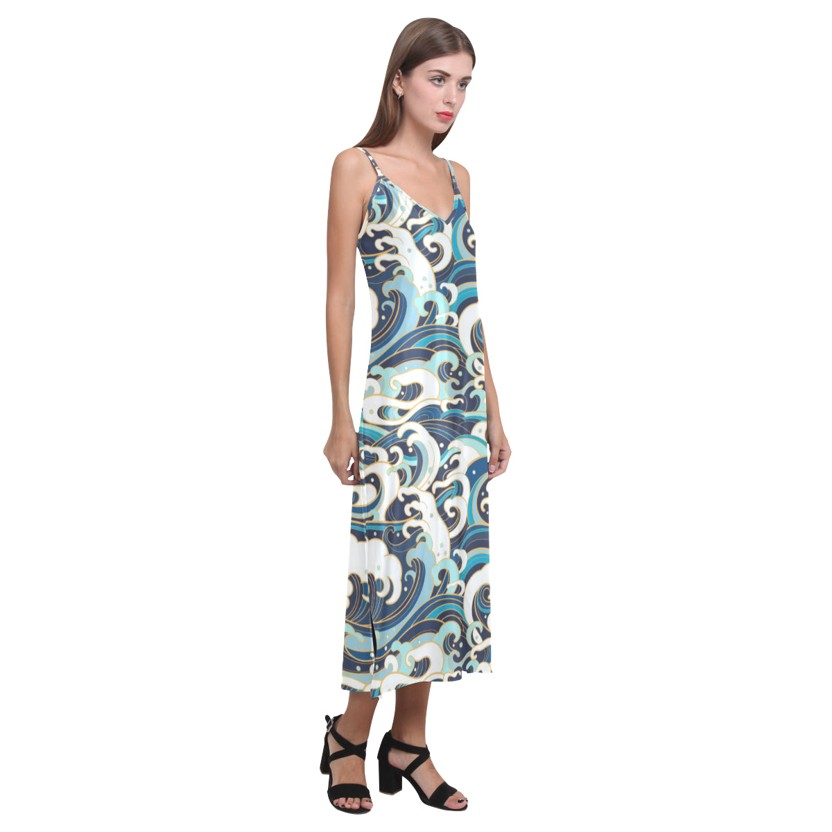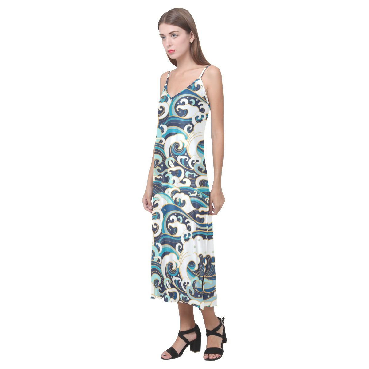 Japanese wave pattern V-Neck Open Fork Long Dress