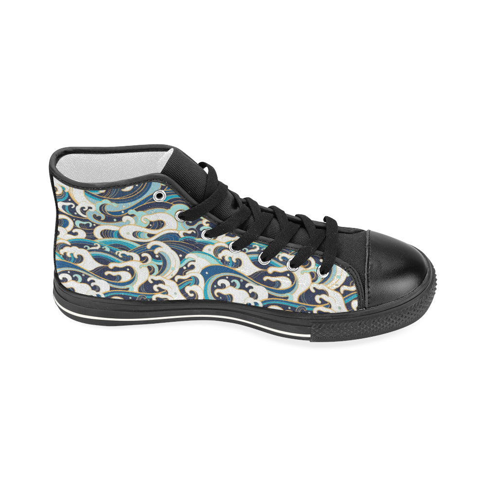 Japanese wave pattern Women's High Top Canvas Shoes Black