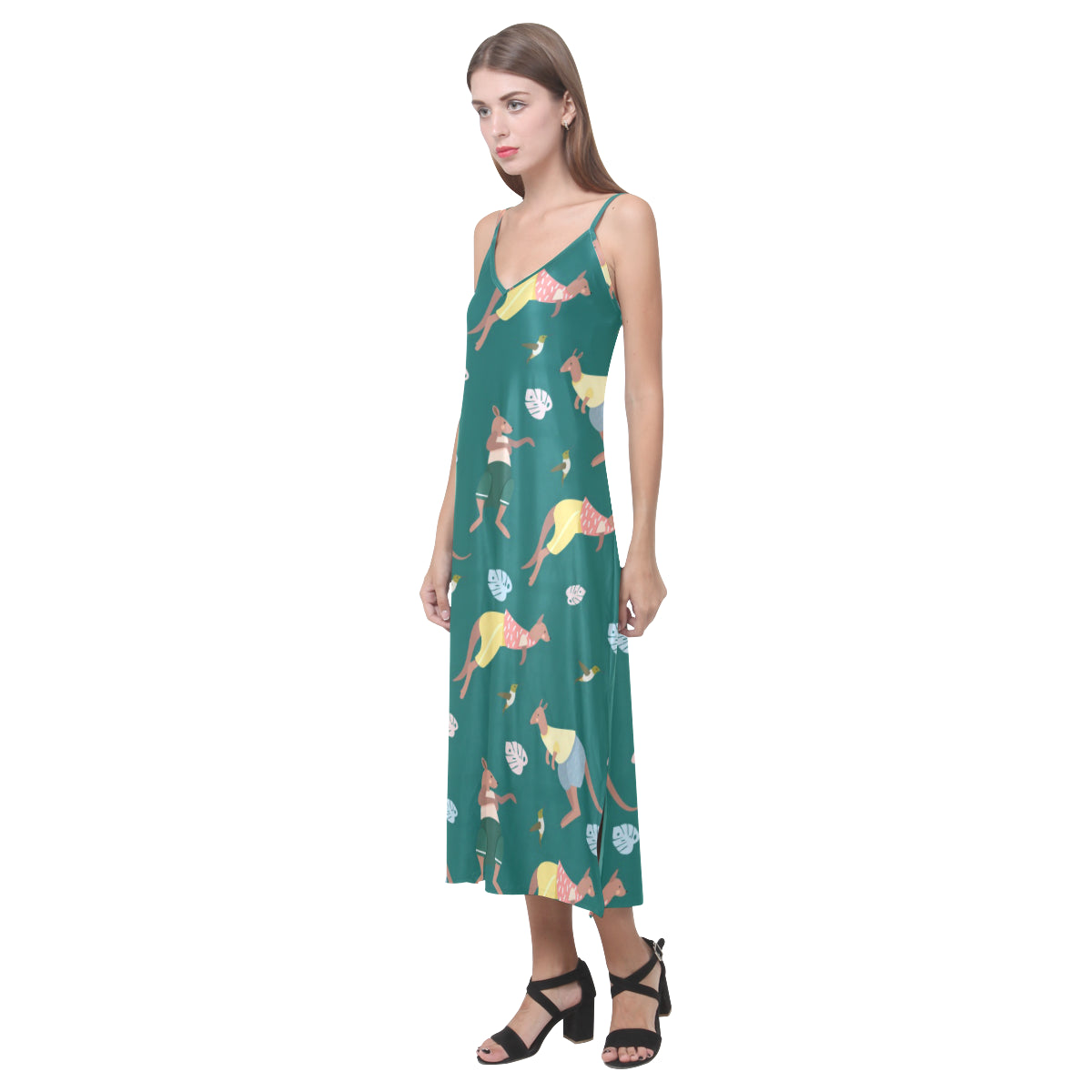 Kangaroo leaves pattern V-Neck Open Fork Long Dress is a uniqued design and limited item. It made to order, hand printed, and sewn with love in our factory.