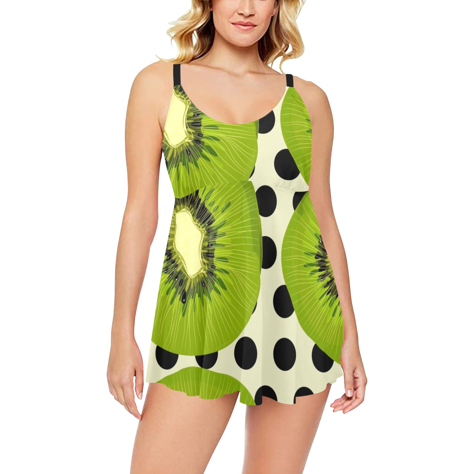 kiwi black dot background Chest Sexy Pleated Two Piece Swim Dress