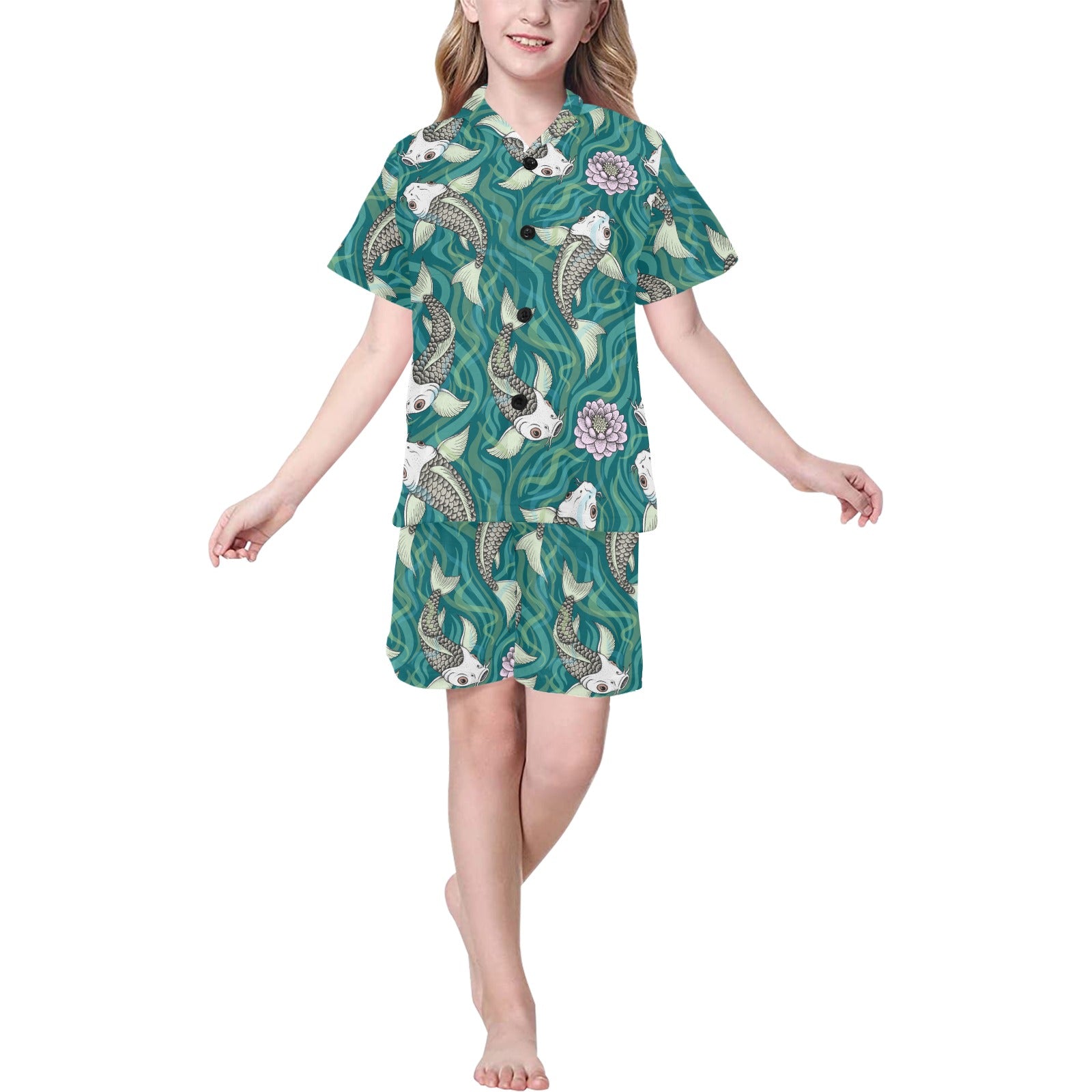 Koi Fish Carp Fish lotus pattern Kids' Boys' Girls' V-Neck Short Pajama Set