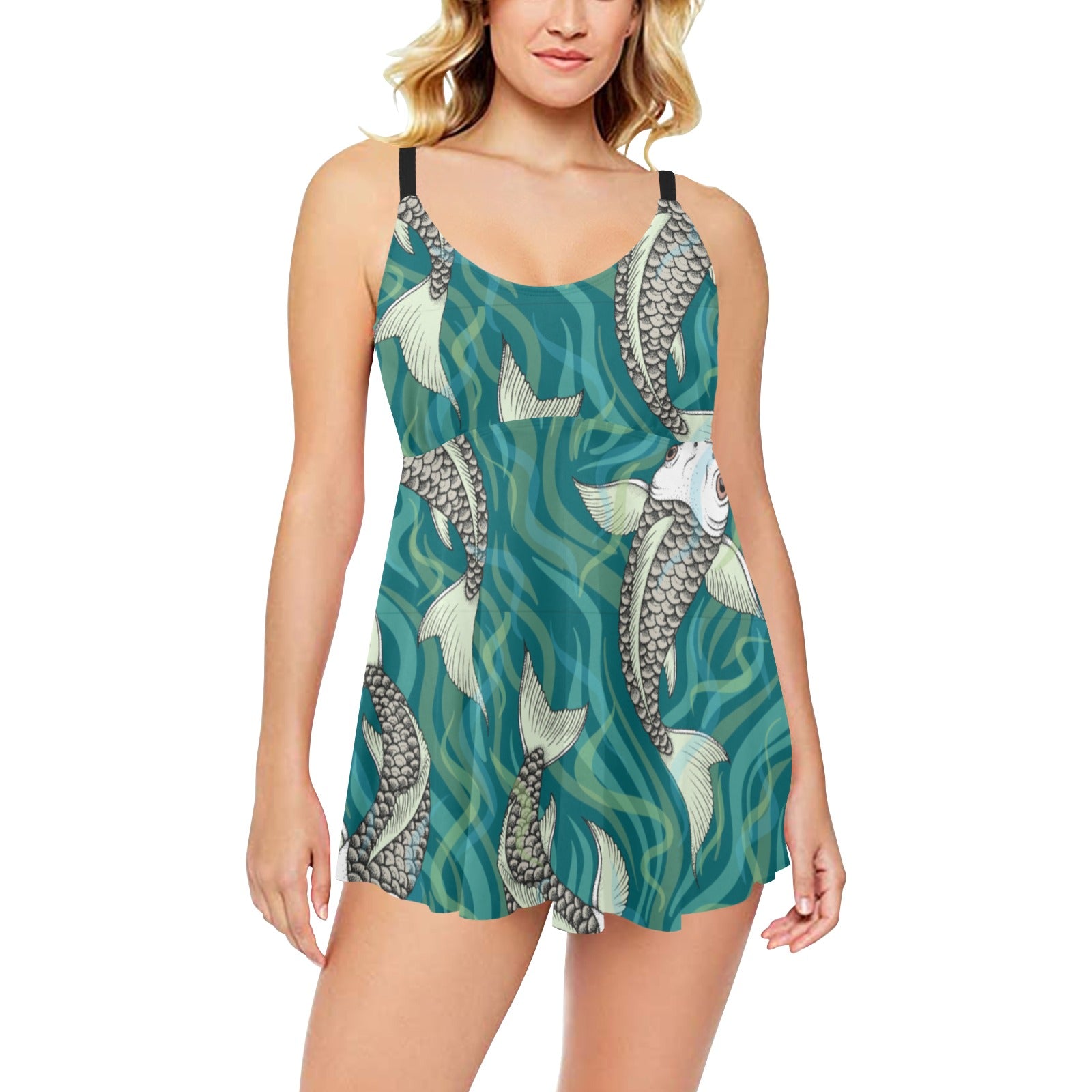 Koi Fish Carp Fish lotus pattern Chest Sexy Pleated Two Piece Swim Dress