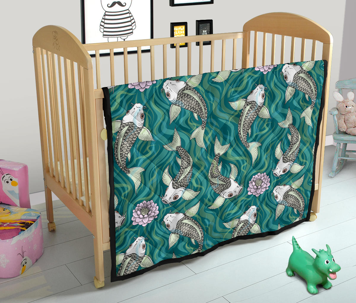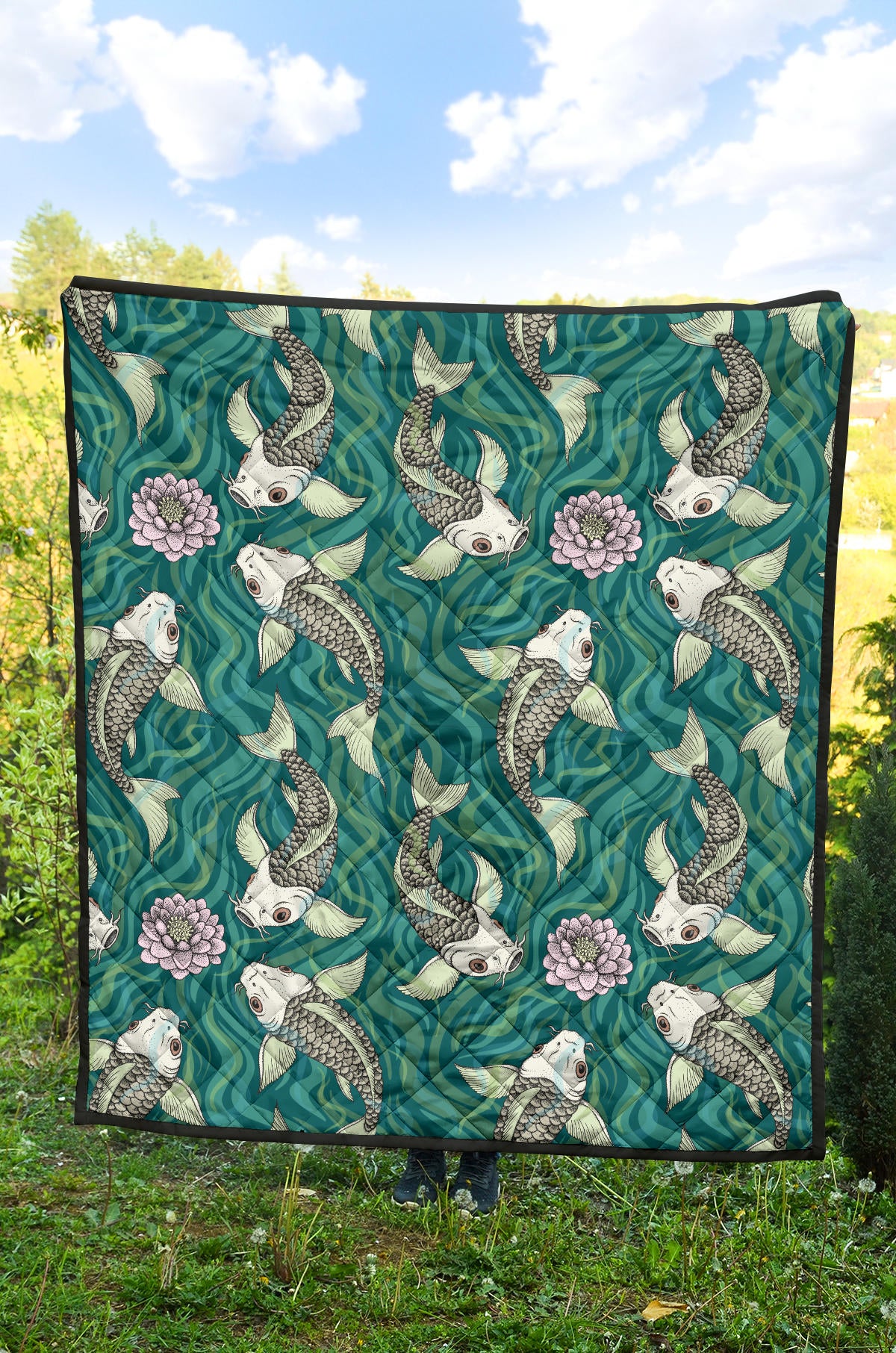 Koi Fish Carp Fish Lotus Pattern Premium Quilt is a uniqued design and limited item. It made to order, hand printed, and sewn with love in our factory.