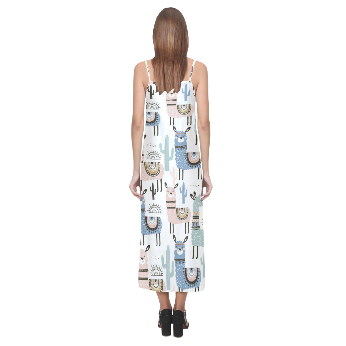 lama Alpaca cactus hand drawn pattern V-Neck Open Fork Long Dress