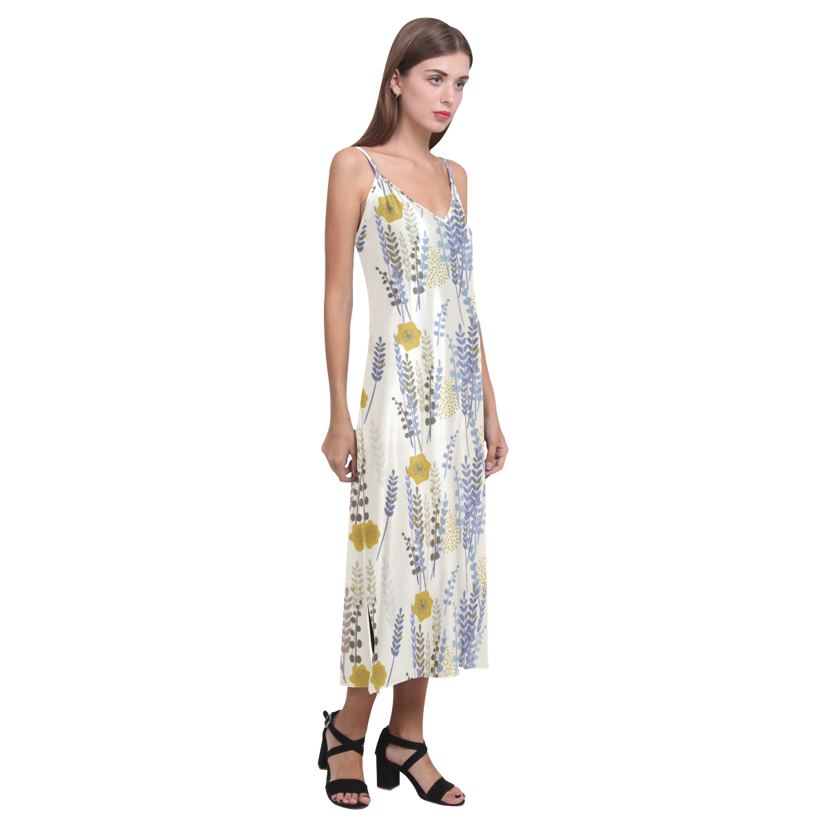 Lavender modern pattern blackground V-Neck Open Fork Long Dress is a uniqued design and limited item. It made to order, hand printed, and sewn with love in our factory.