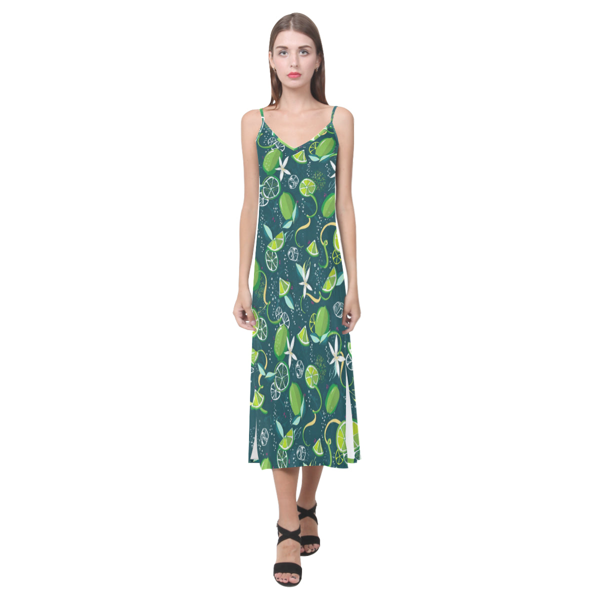 Lime ice flower pattern V-Neck Open Fork Long Dress is a uniqued design and limited item. It made to order, hand printed, and sewn with love in our factory.