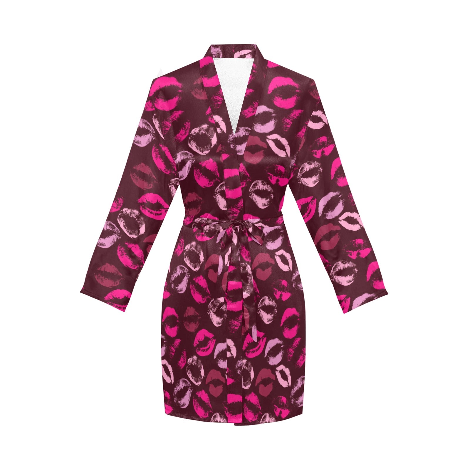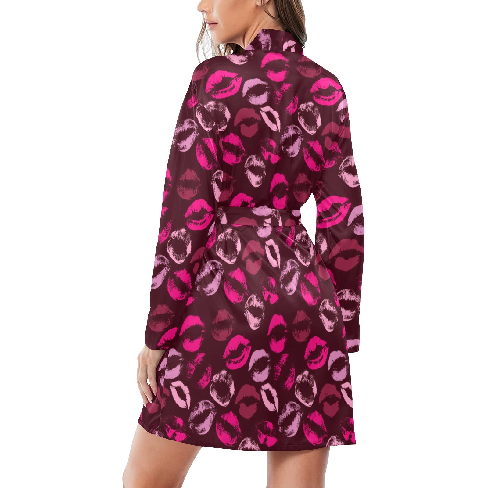 Lips Pattern Print Design 03 Women's Long Sleeve Belted Night Robe