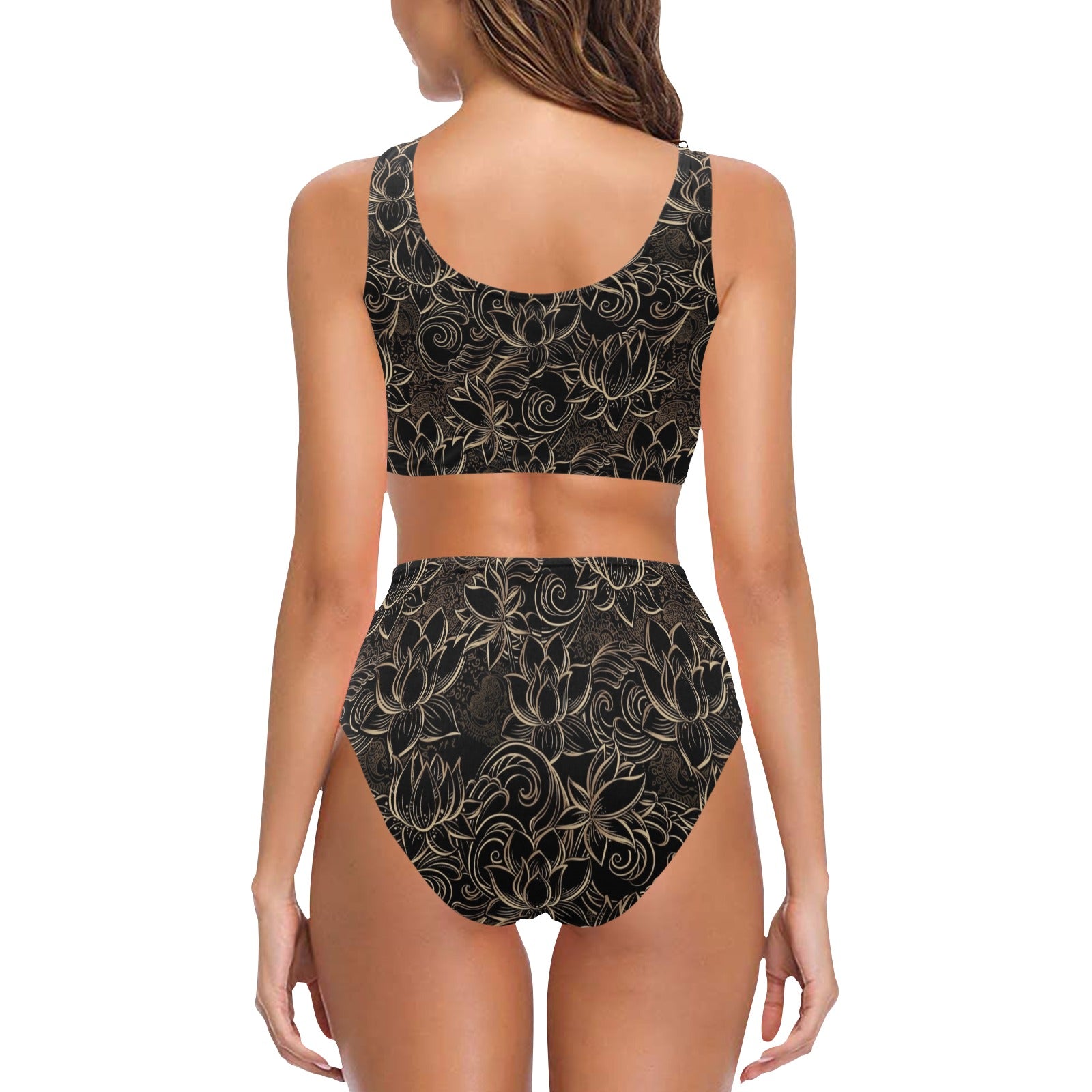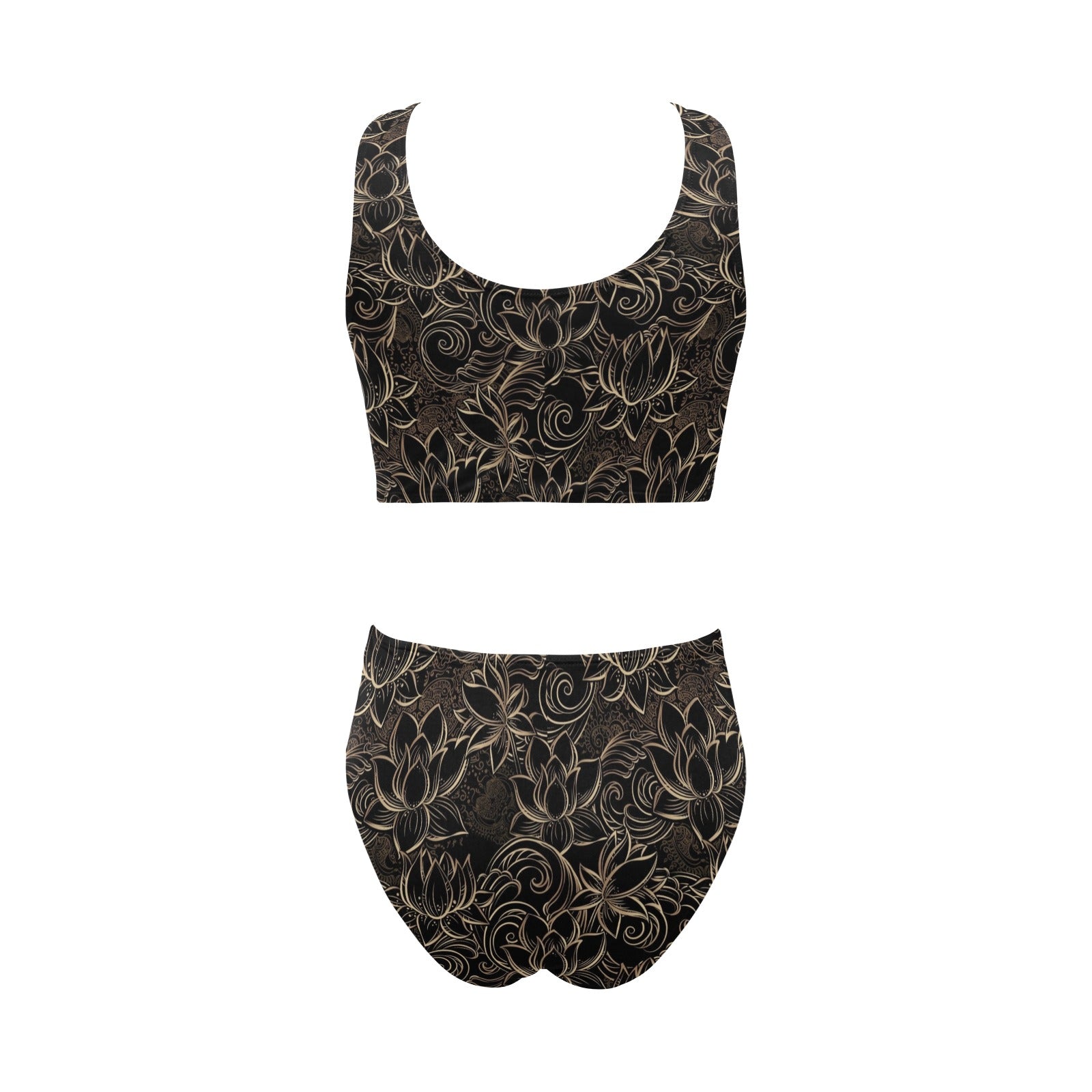 luxurious gold lotus waterlily black background Chest Bowknot High Waisted Bikini Swimsuit