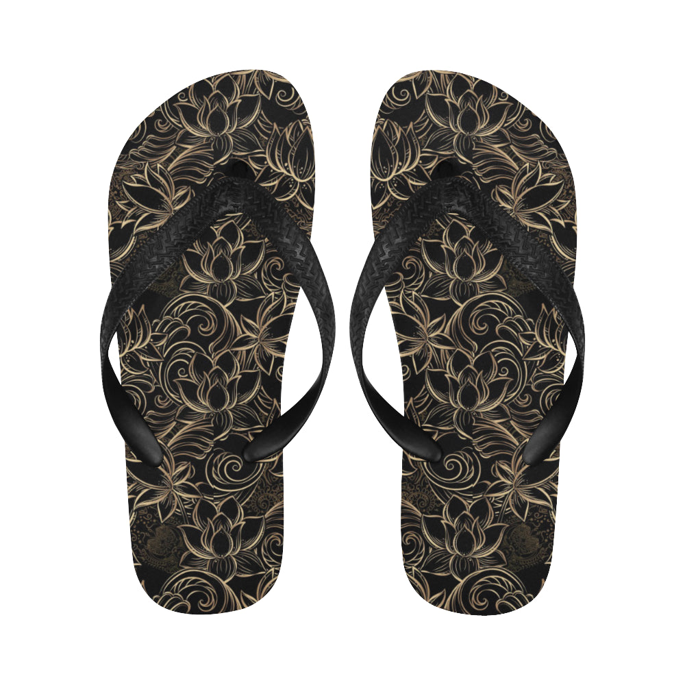 luxurious gold lotus waterlily black background Unisex Flip Flops is a uniqued design and limited item. It made to order, hand printed, and sewn with love in our factory.