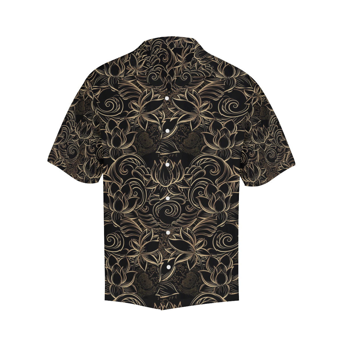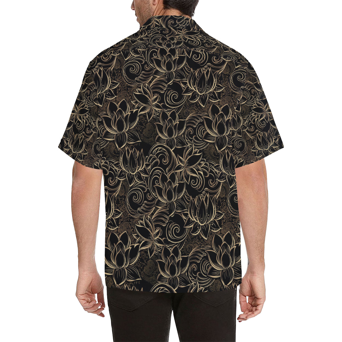 luxurious gold lotus waterlily black background Men's All Over Print Hawaiian Shirt is a uniqued design and limited item. It made to order, hand printed, and sewn with love in our factory.