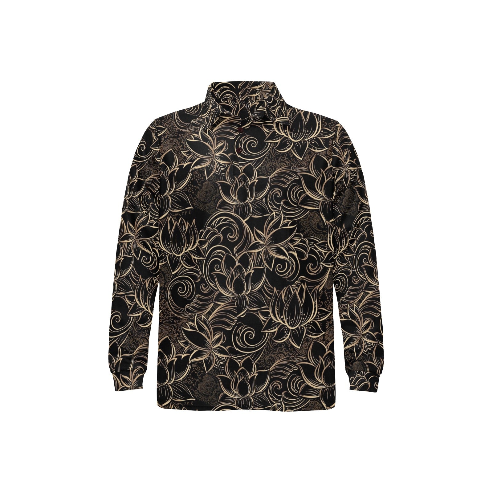 luxurious gold lotus waterlily black background Men's Long Sleeve Polo Shirt