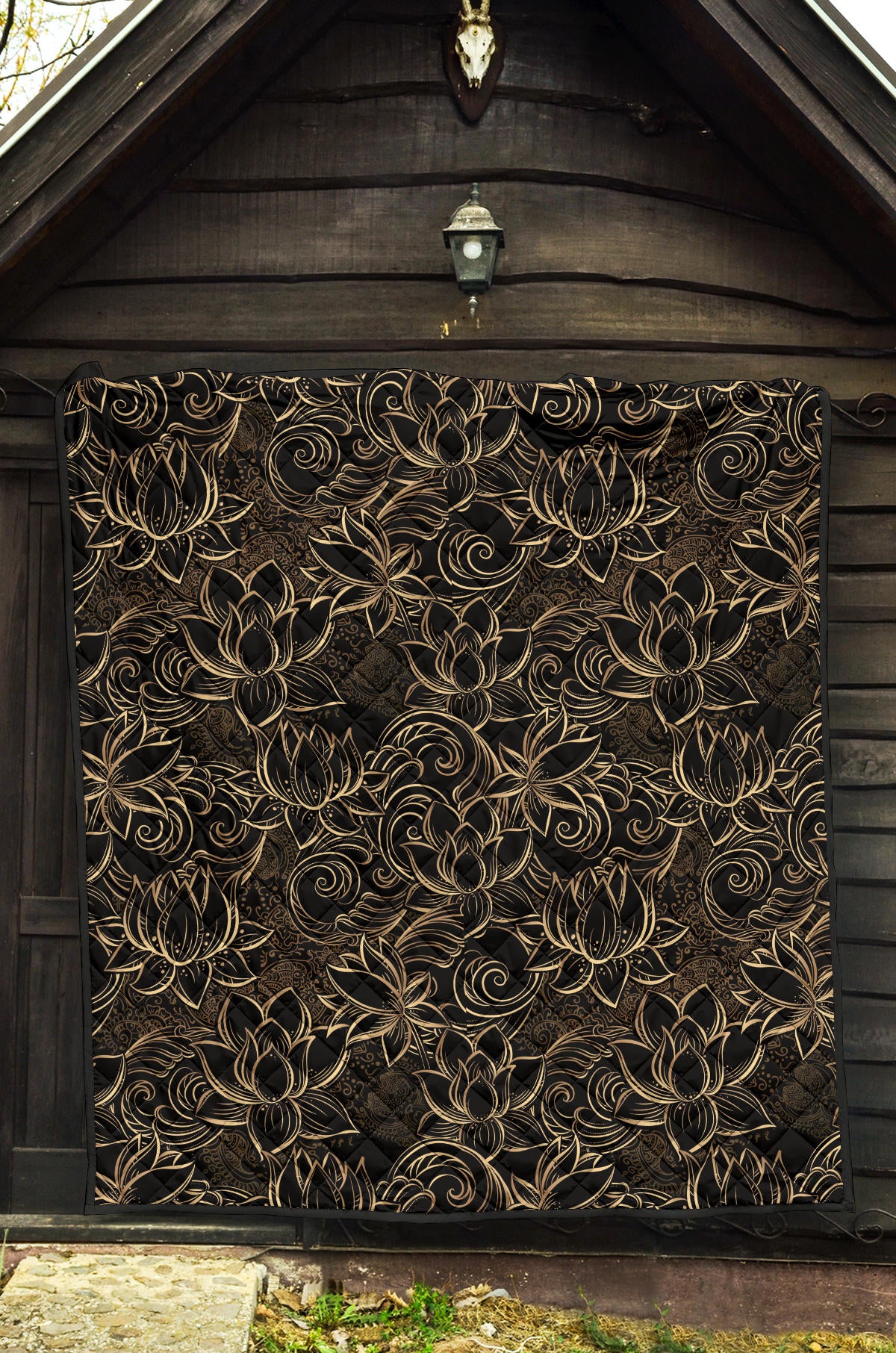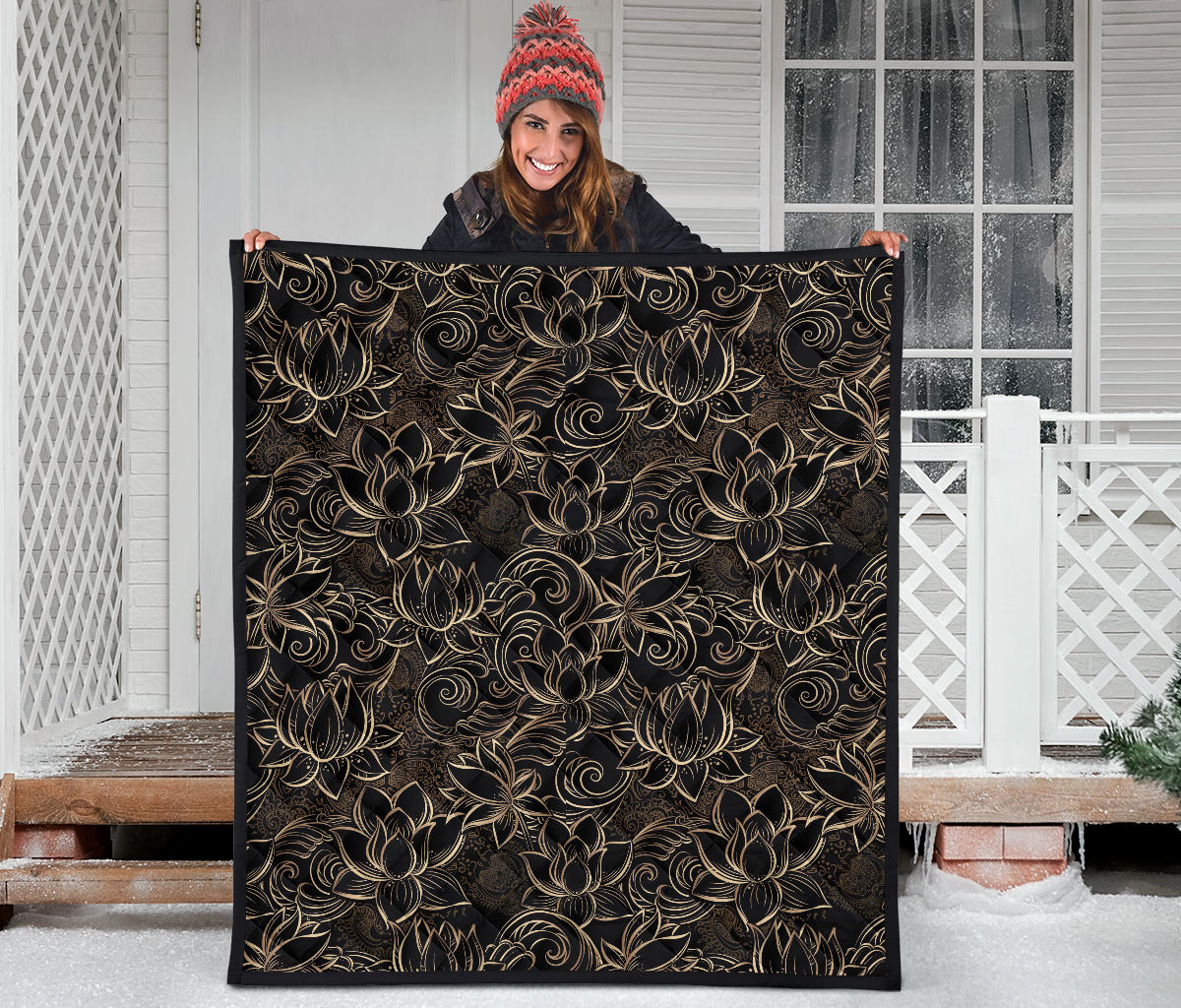 Luxurious Gold Lotus Waterlily Black Background Premium Quilt is a uniqued design and limited item. It made to order, hand printed, and sewn with love in our factory.