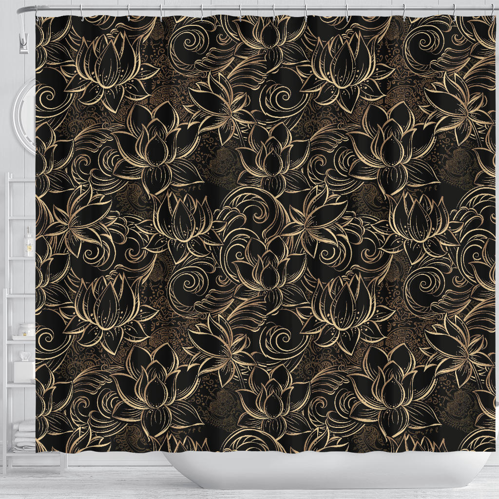 Luxurious Gold Lotus Waterlily Black Background Shower Curtain Fulfilled In US