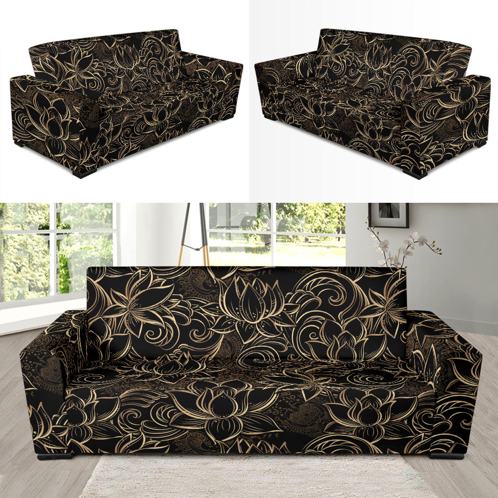 Luxurious Gold Lotus Waterlily Black Background Sofa Slipcover