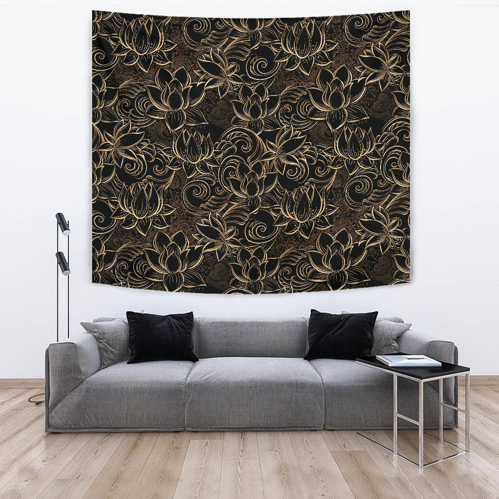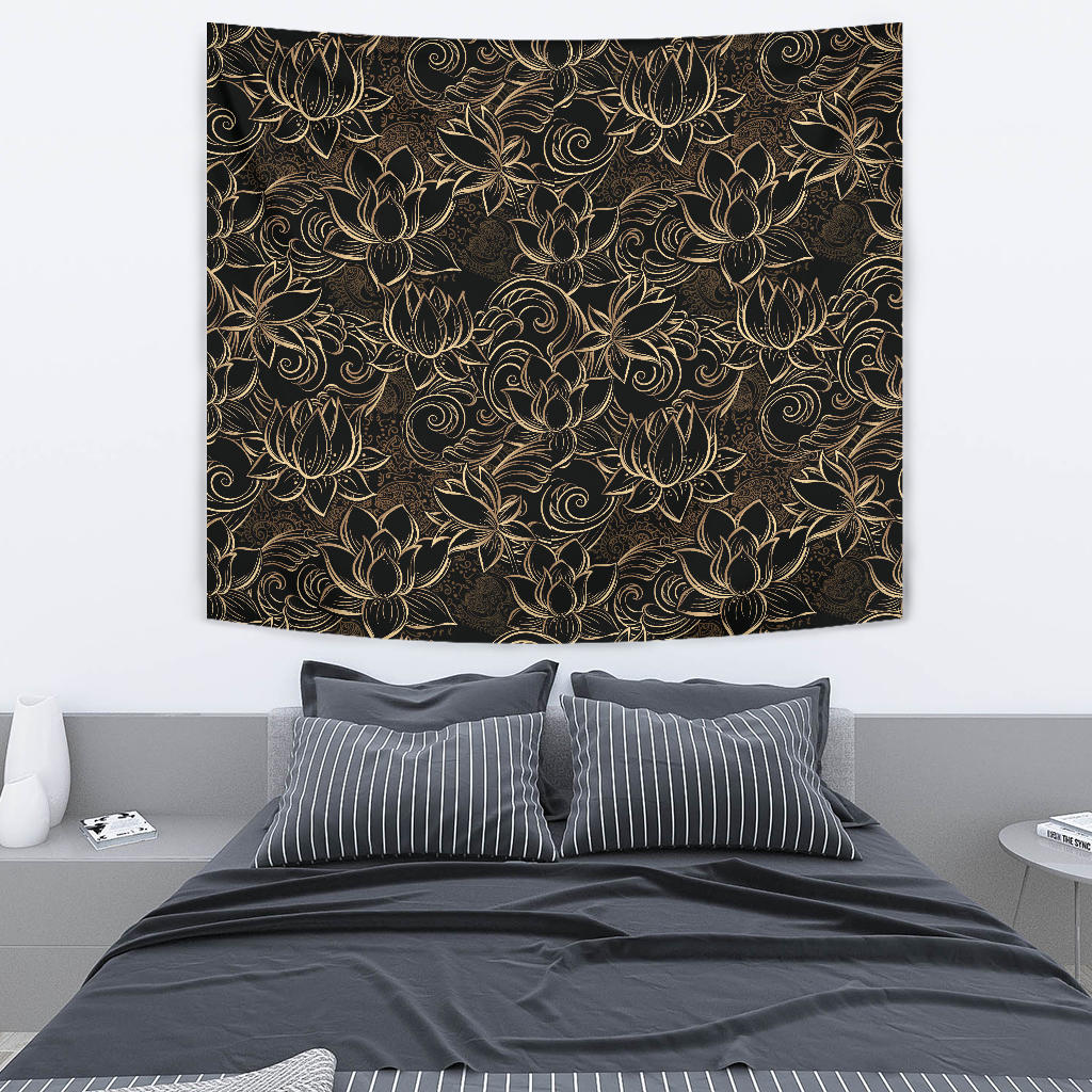 luxurious gold lotus waterlily black background Tapestry is a uniqued design and limited item. It made to order, hand printed, and sewn with love in our factory.