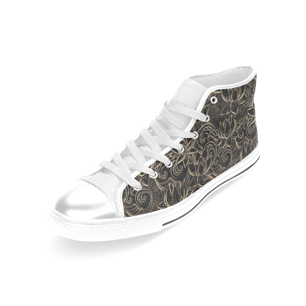 luxurious gold lotus waterlily black background Women's High Top Canvas Shoes White
