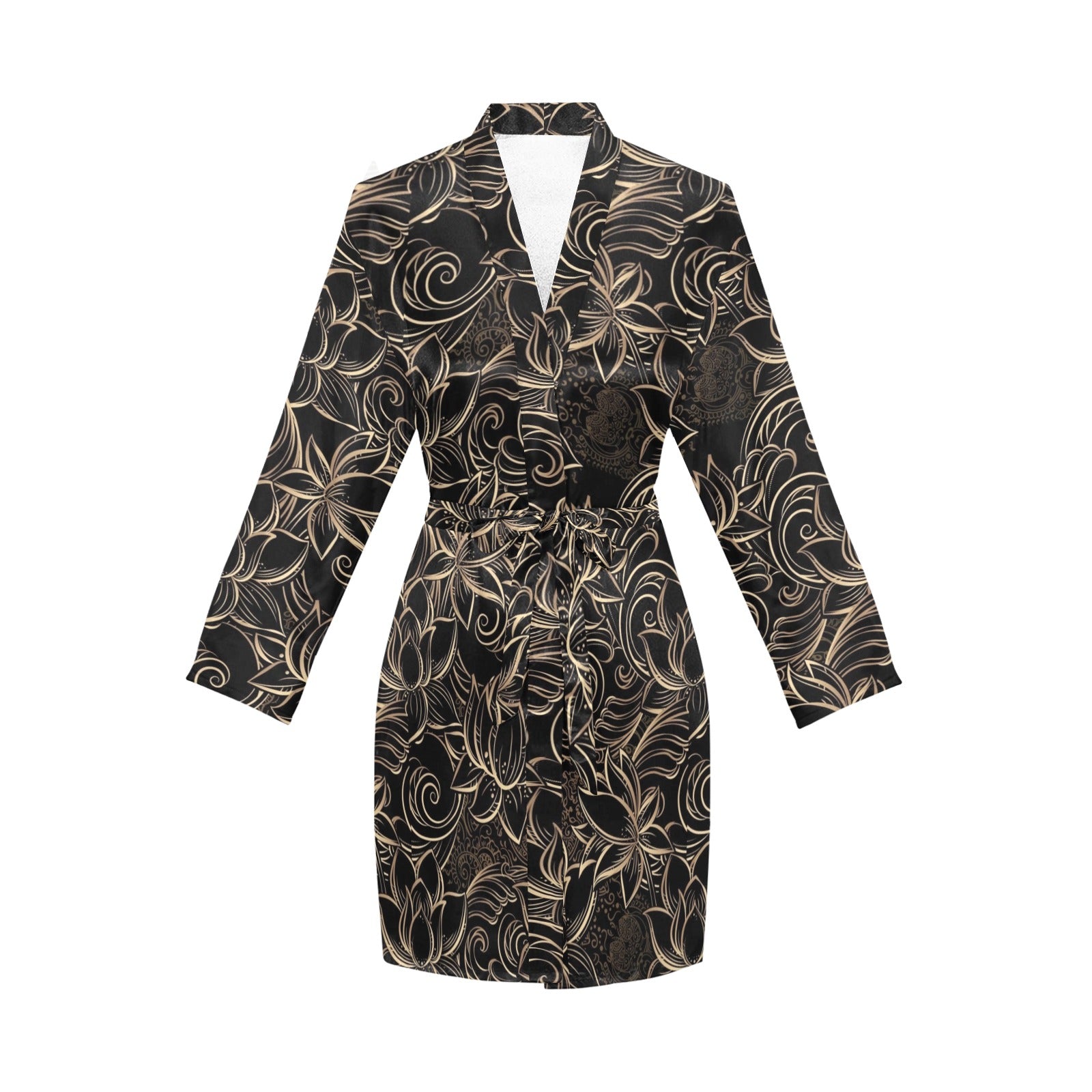 luxurious gold lotus waterlily black background Women's Long Sleeve Belted Night Robe