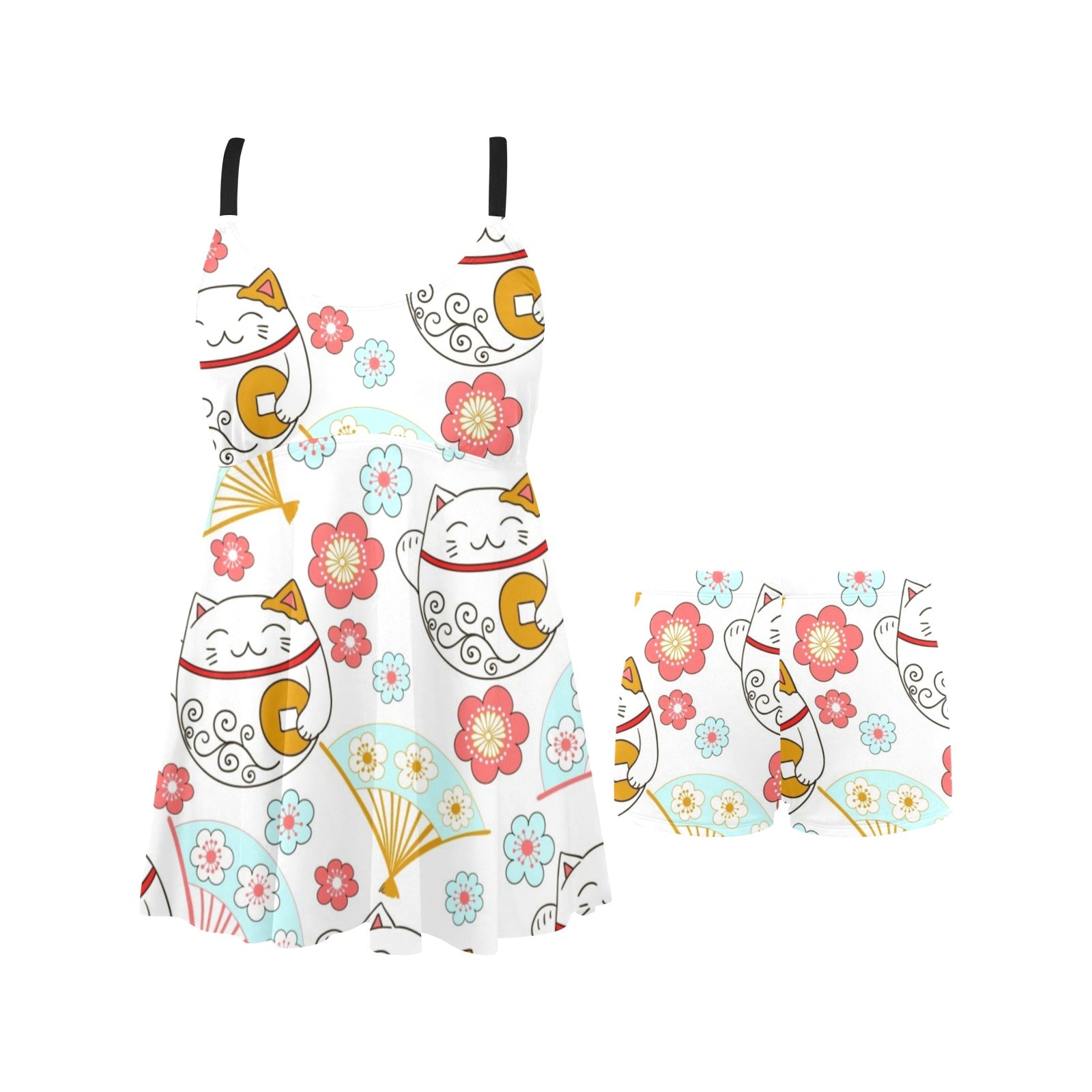 Maneki neko cat fan sakura Chest Sexy Pleated Two Piece Swim Dress