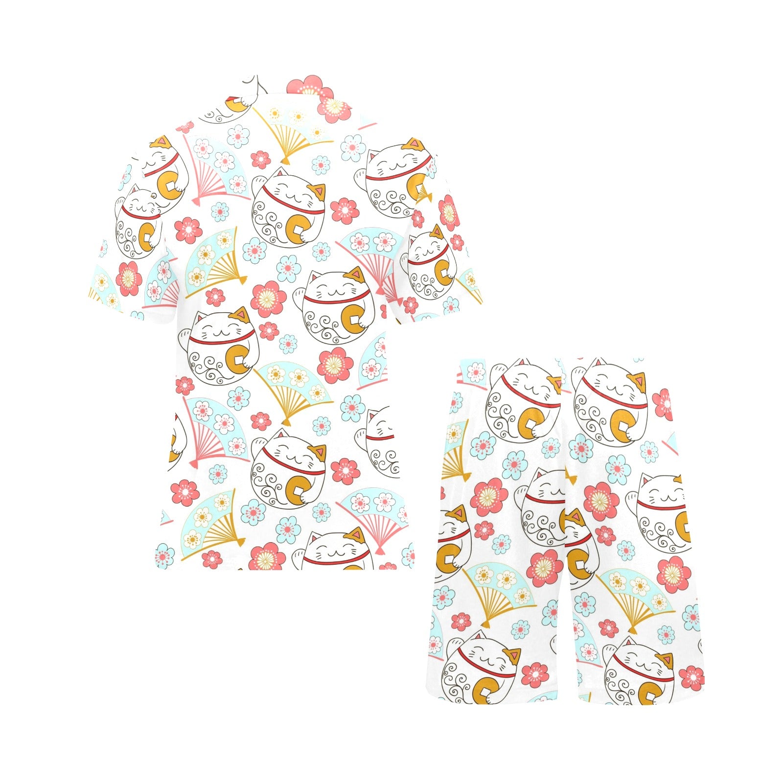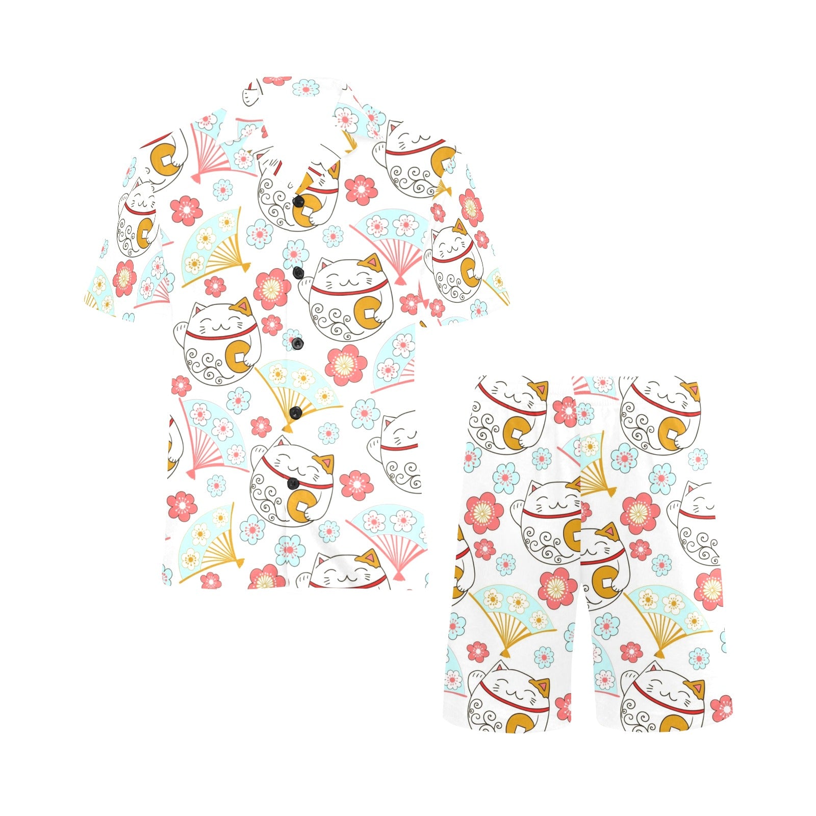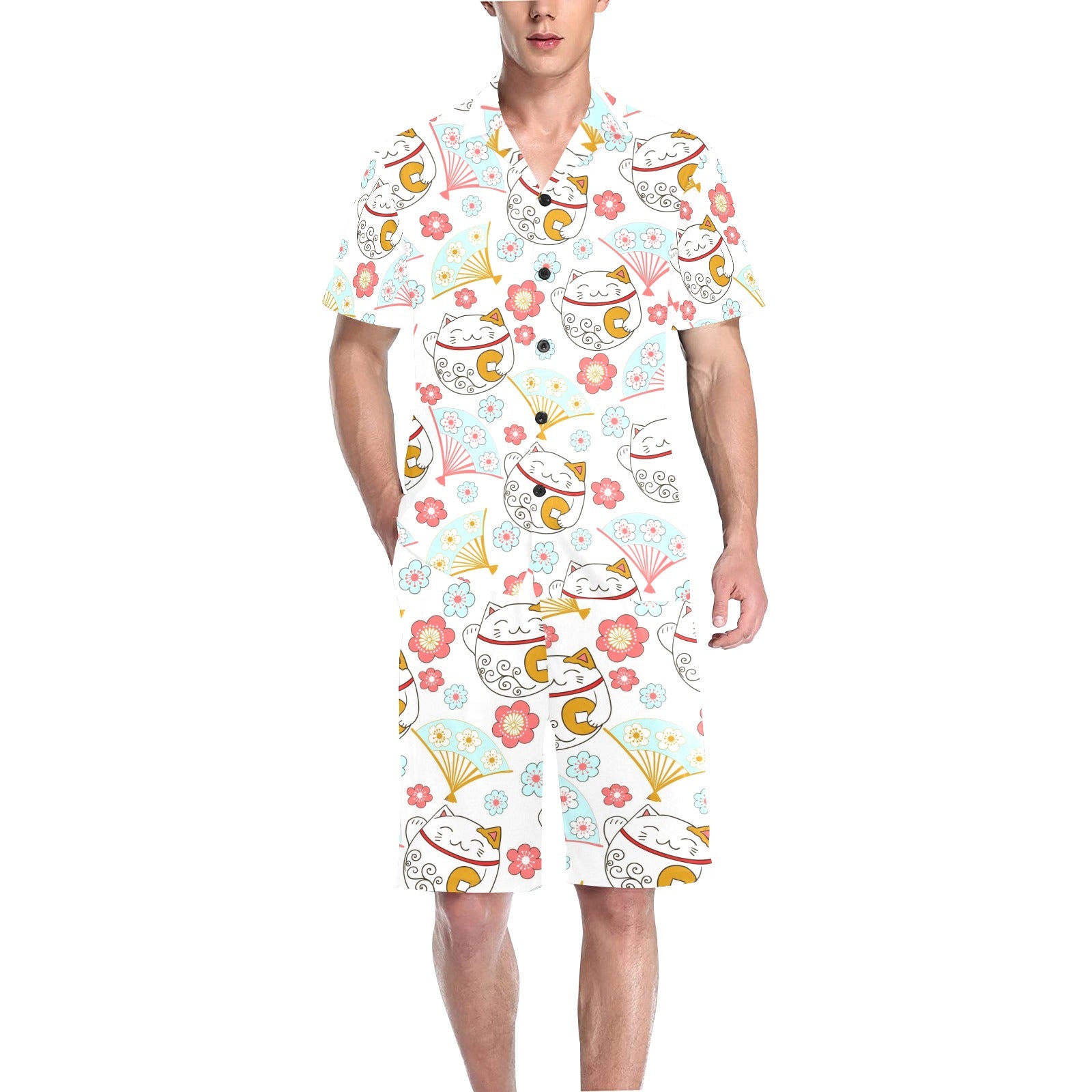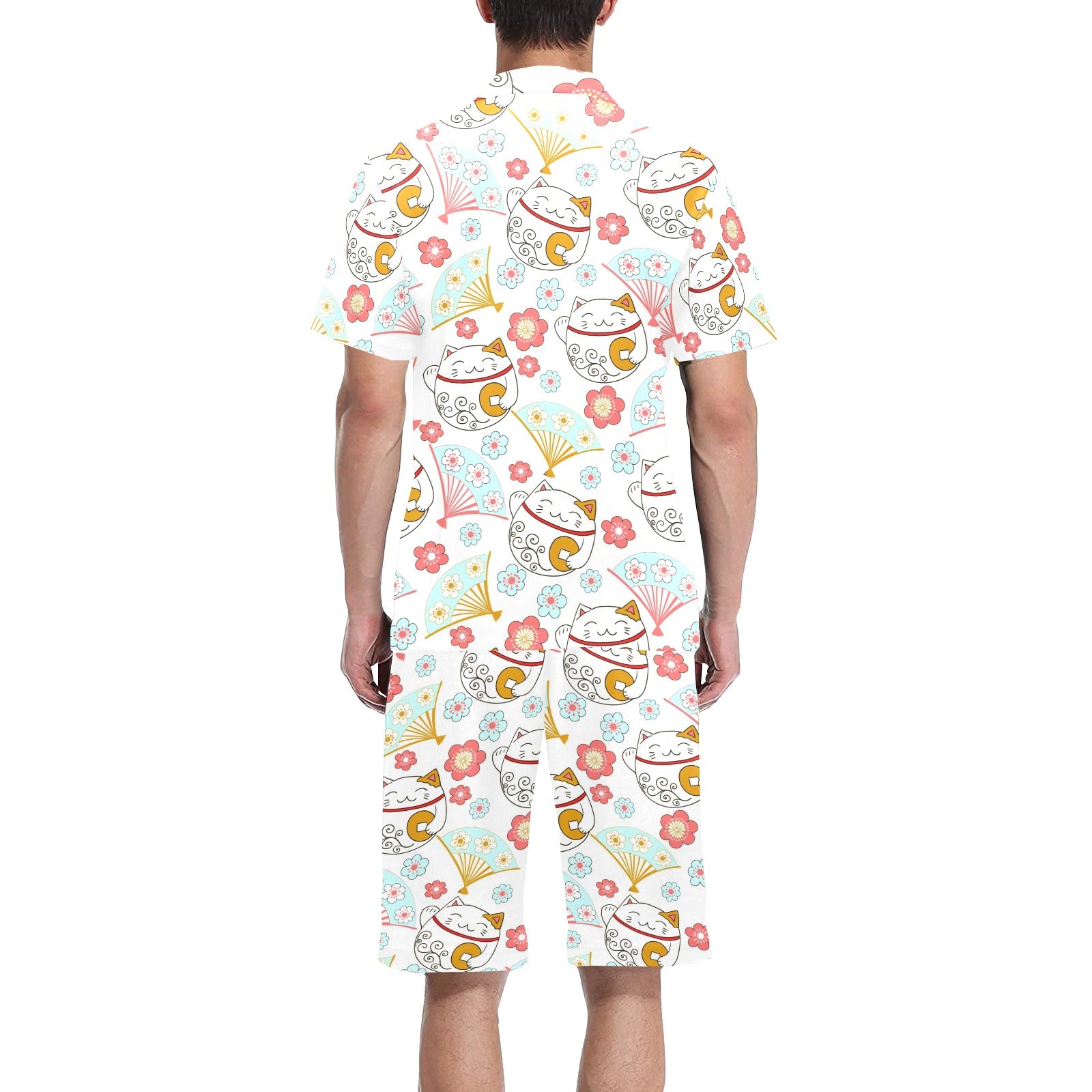 Maneki neko cat fan sakura Men's V-Neck Short Pajama Set