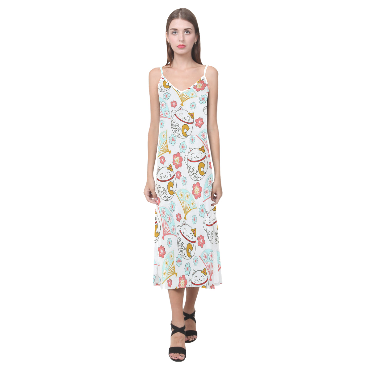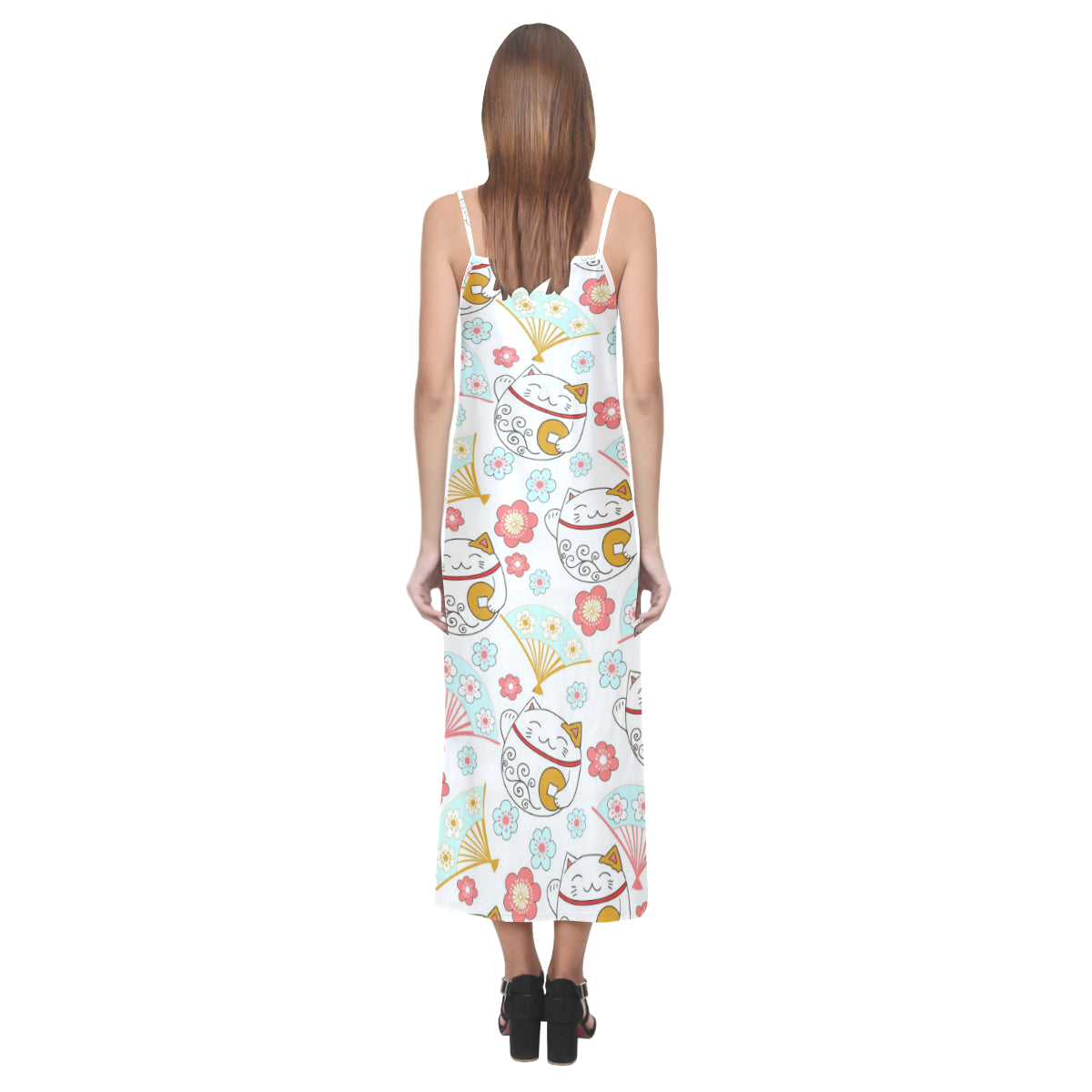 Maneki neko cat fan sakura V-Neck Open Fork Long Dress is a uniqued design and limited item. It made to order, hand printed, and sewn with love in our factory.