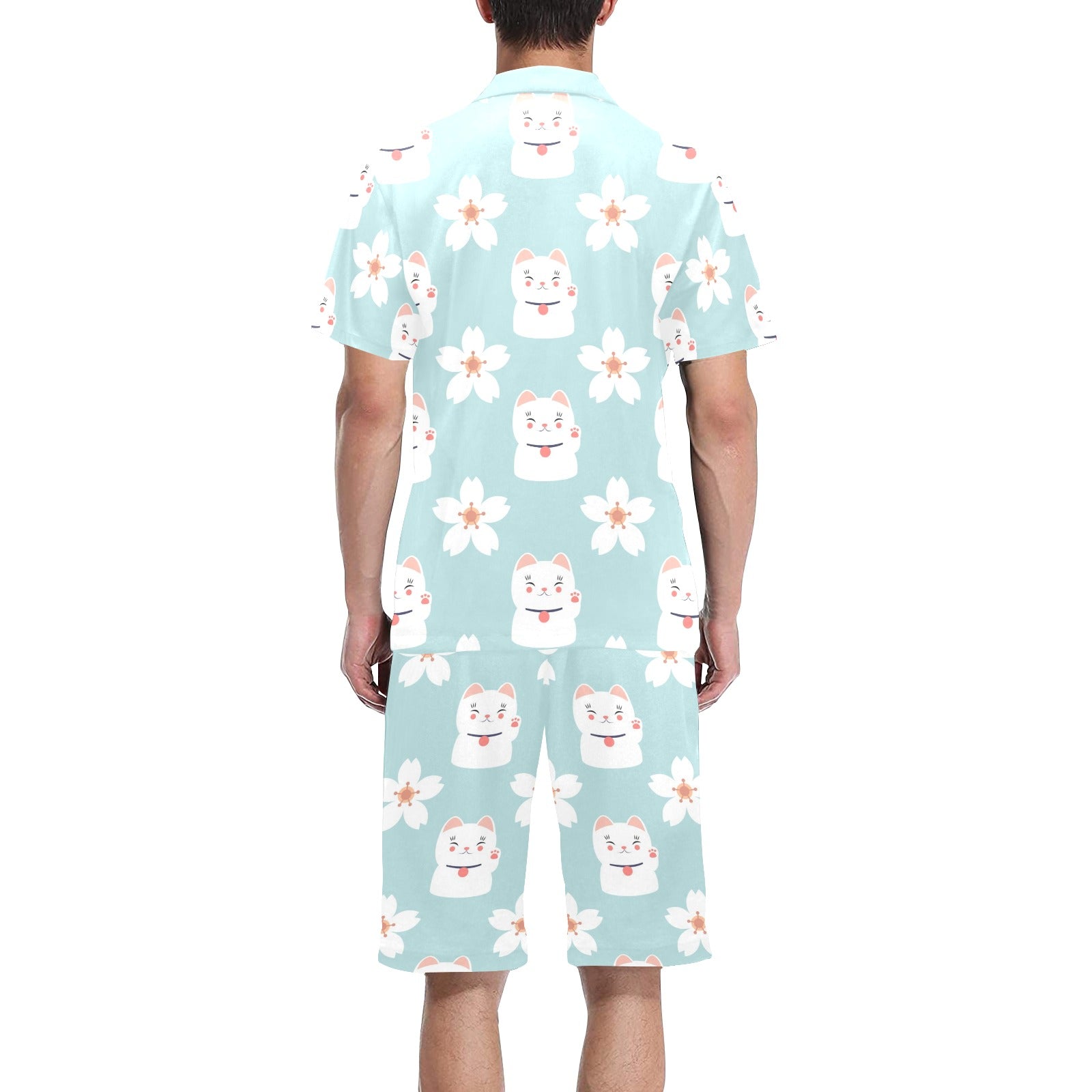 Maneki neko cat sakura Men's V-Neck Short Pajama Set