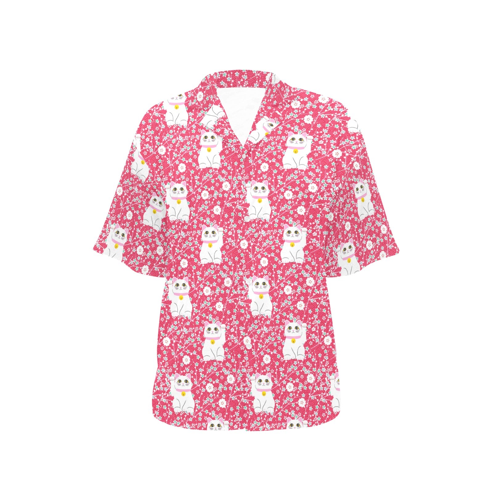 Maneki neko cat sakura pink background Women's All Over Print Hawaiian Shirt