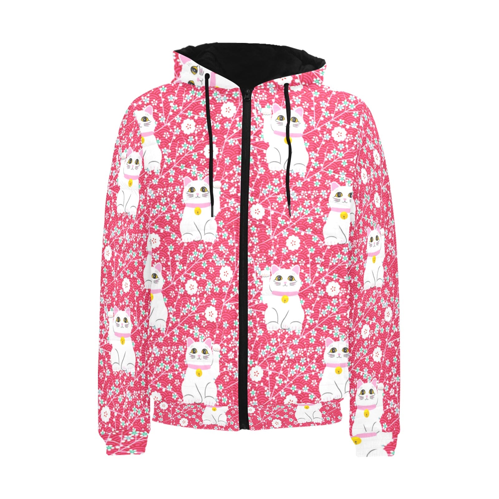 Maneki neko cat sakura pink background Men's Padded Hooded Jacket