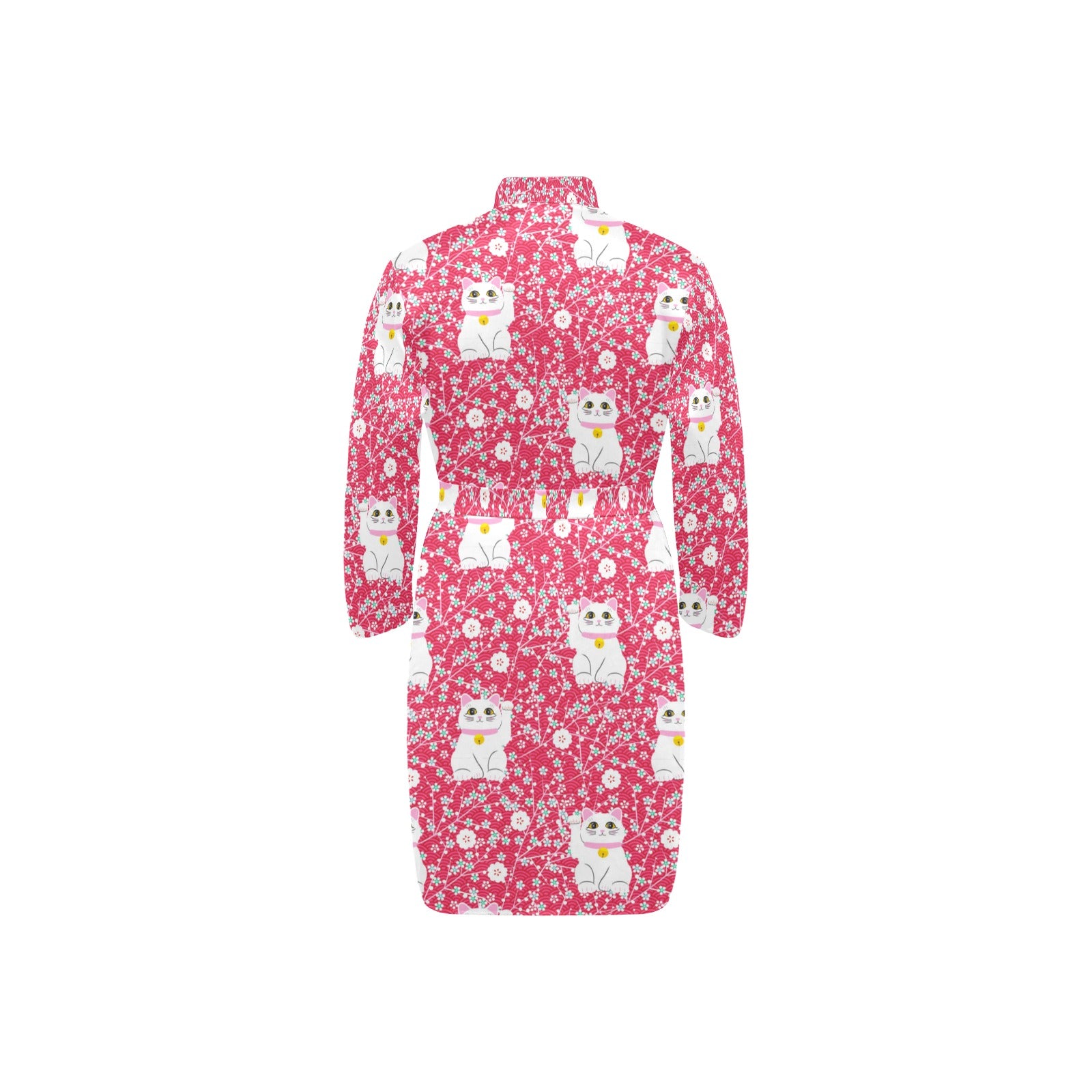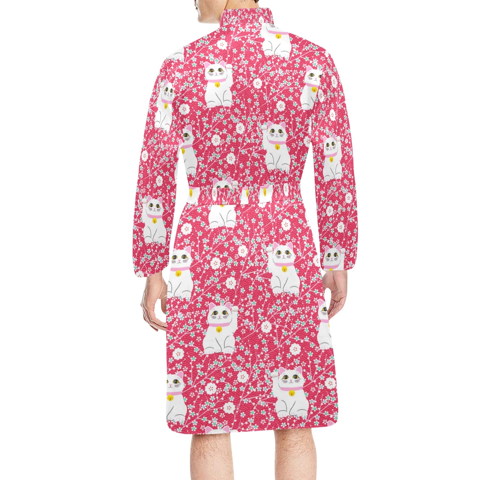 Maneki neko cat sakura pink background Men's Long Sleeve Belted Night Robe