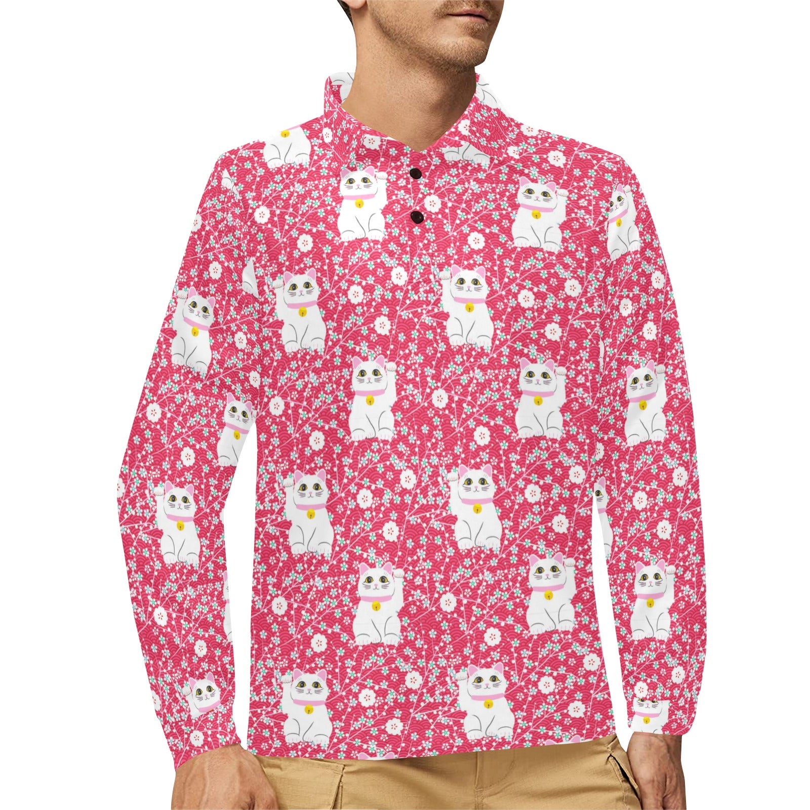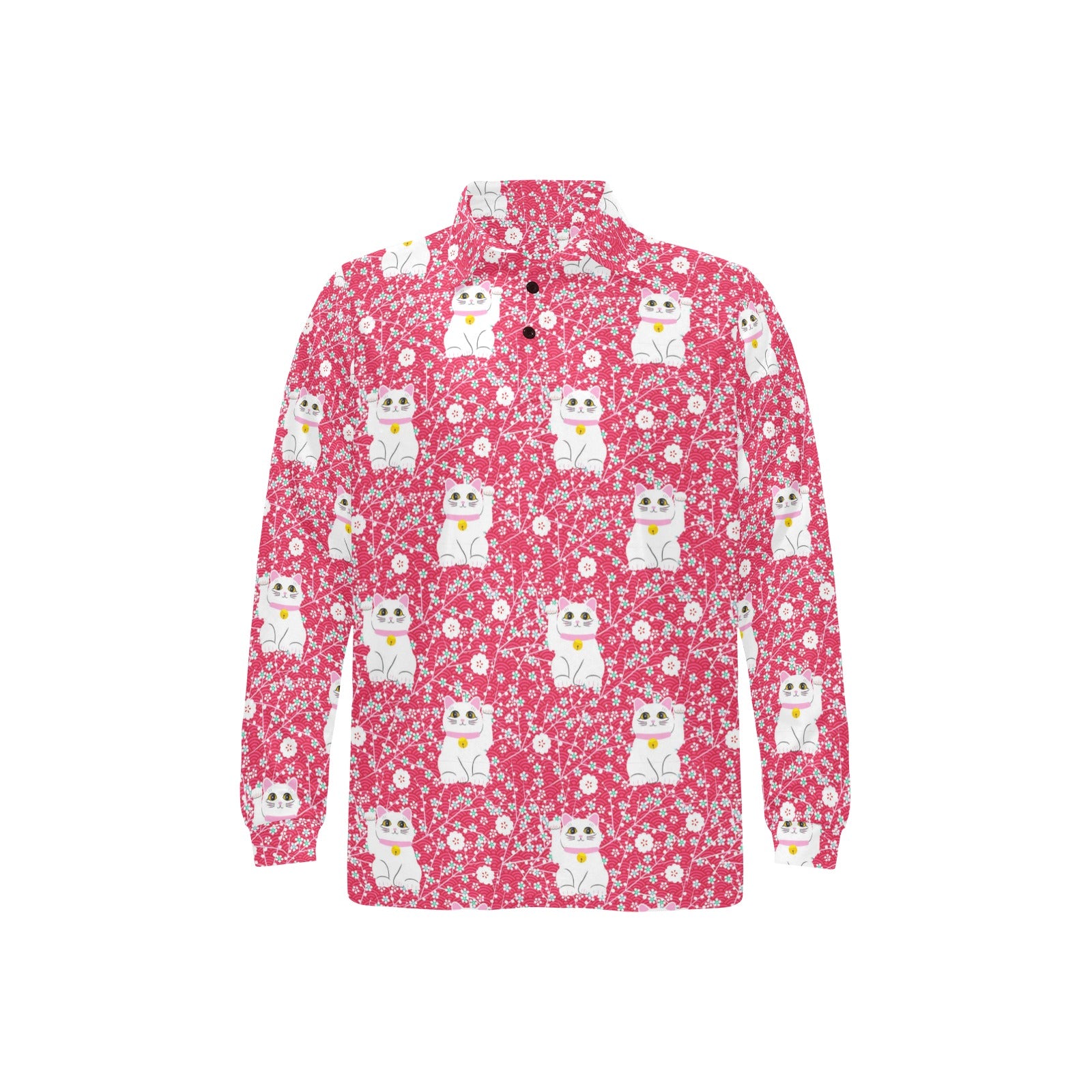 Maneki neko cat sakura pink background Men's Long Sleeve Polo Shirt