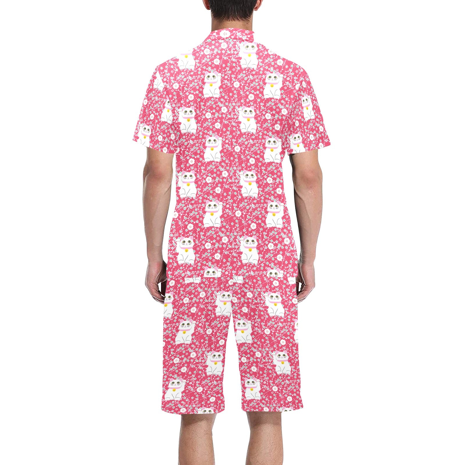Maneki neko cat sakura pink background Men's V-Neck Short Pajama Set