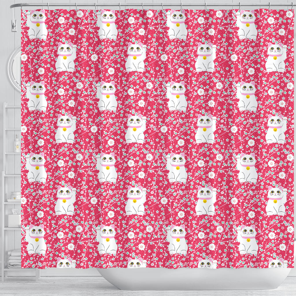Maneki Neko Lucky Cat Sakura Pink Background Shower Curtain Fulfilled In US
