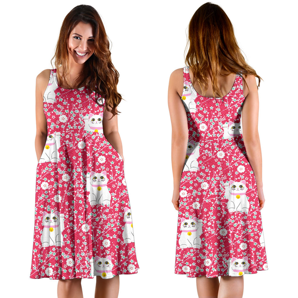 Maneki Neko Lucky Cat Sakura Pink Background Sleeveless Midi Dress