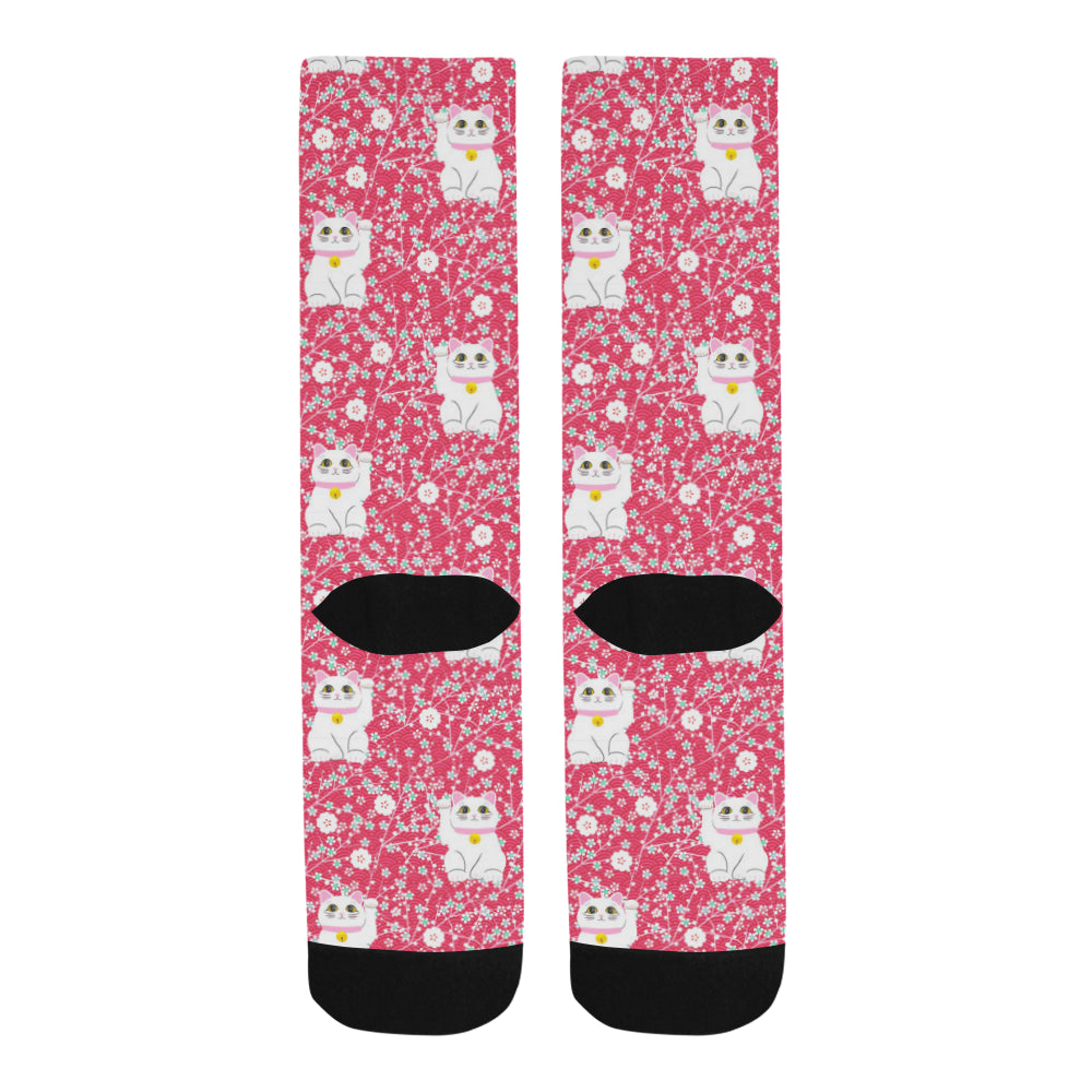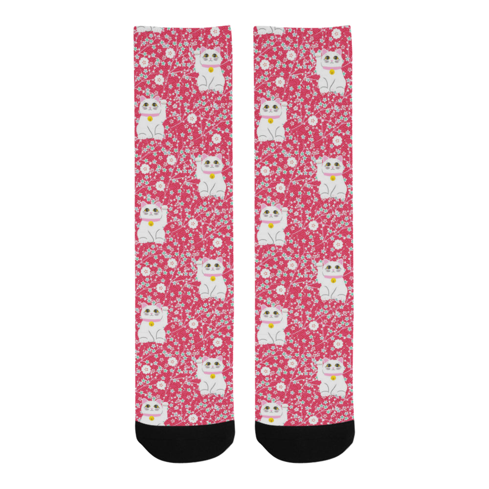 Maneki neko cat sakura pink background Crew Socks are uniqued design and limited item. It made to order, hand printed, and sewn with love in our factory.