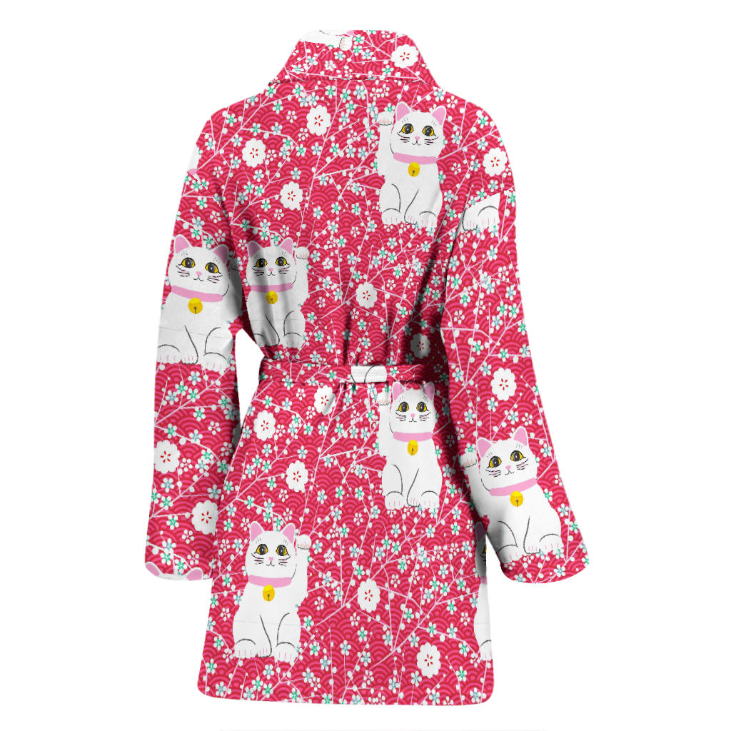 Maneki Neko Lucky Cat Sakura Pink Background Women'S Bathrobe