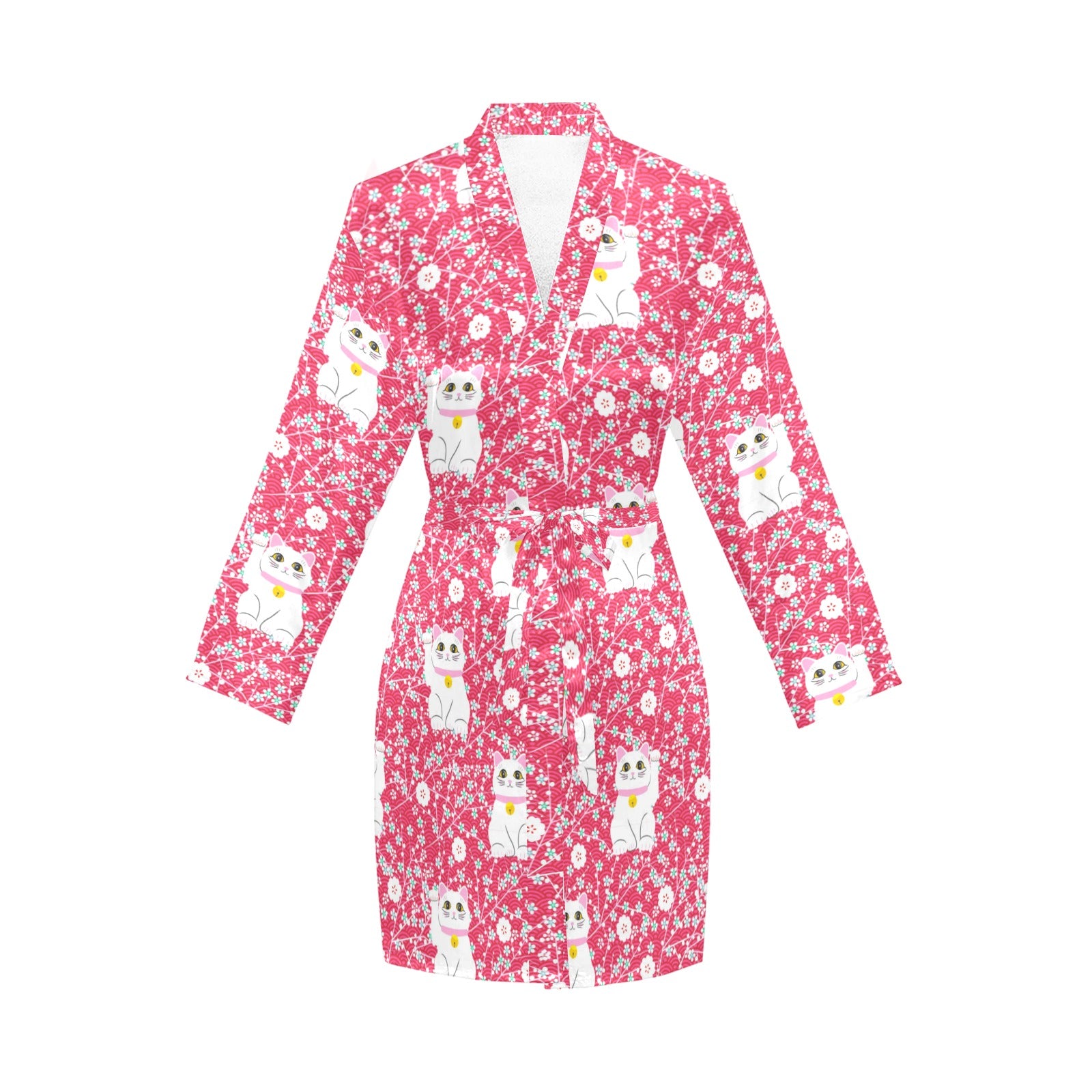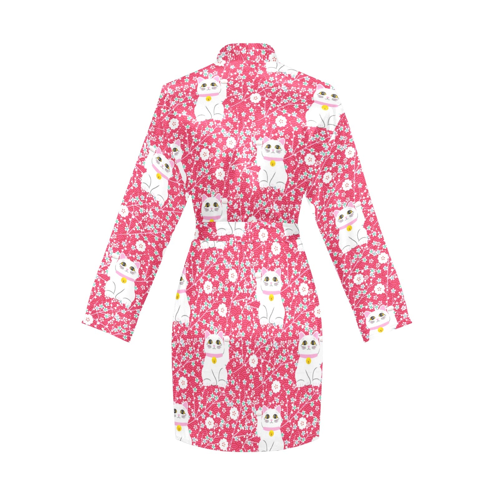 Maneki neko cat sakura pink background Women's Long Sleeve Belted Night Robe