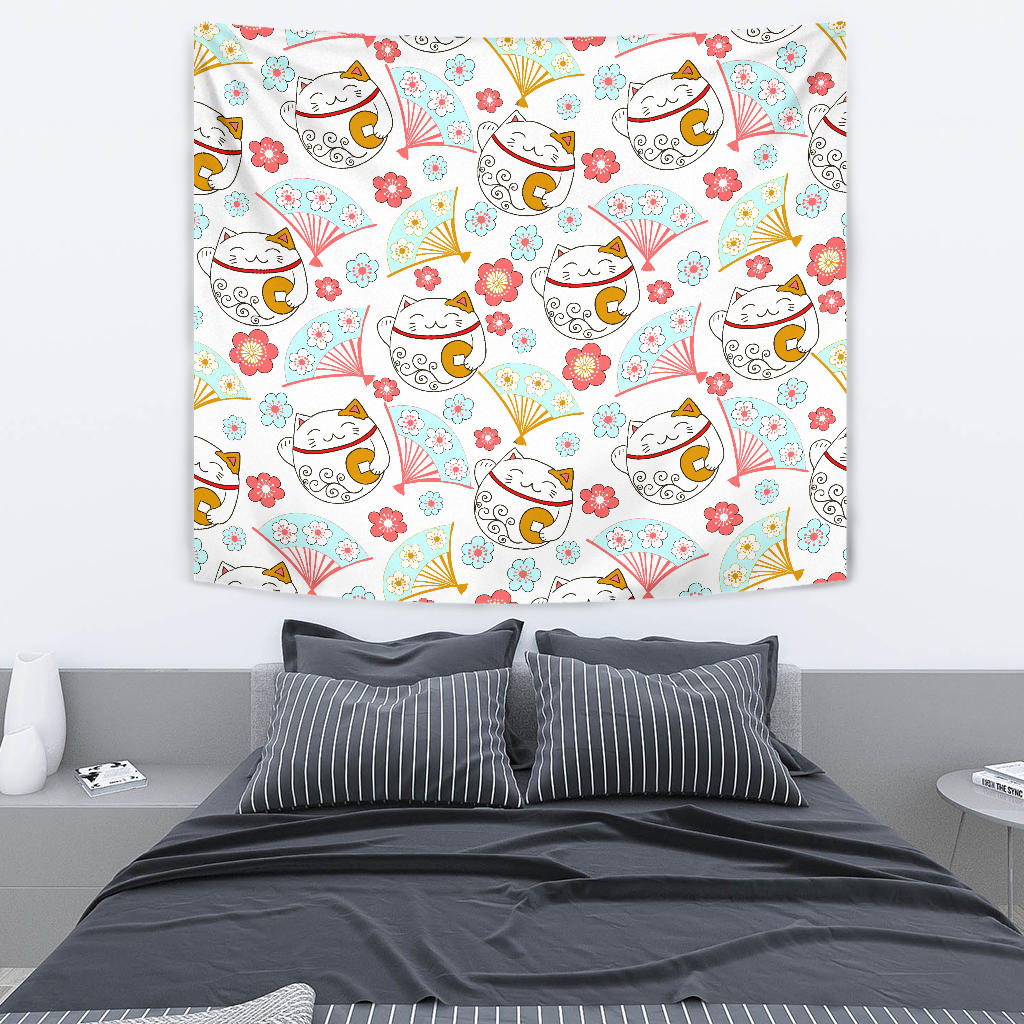Maneki Neko Lucky Cat fan sakura Tapestry is a uniqued design and limited item. It made to order, hand printed, and sewn with love in our factory.