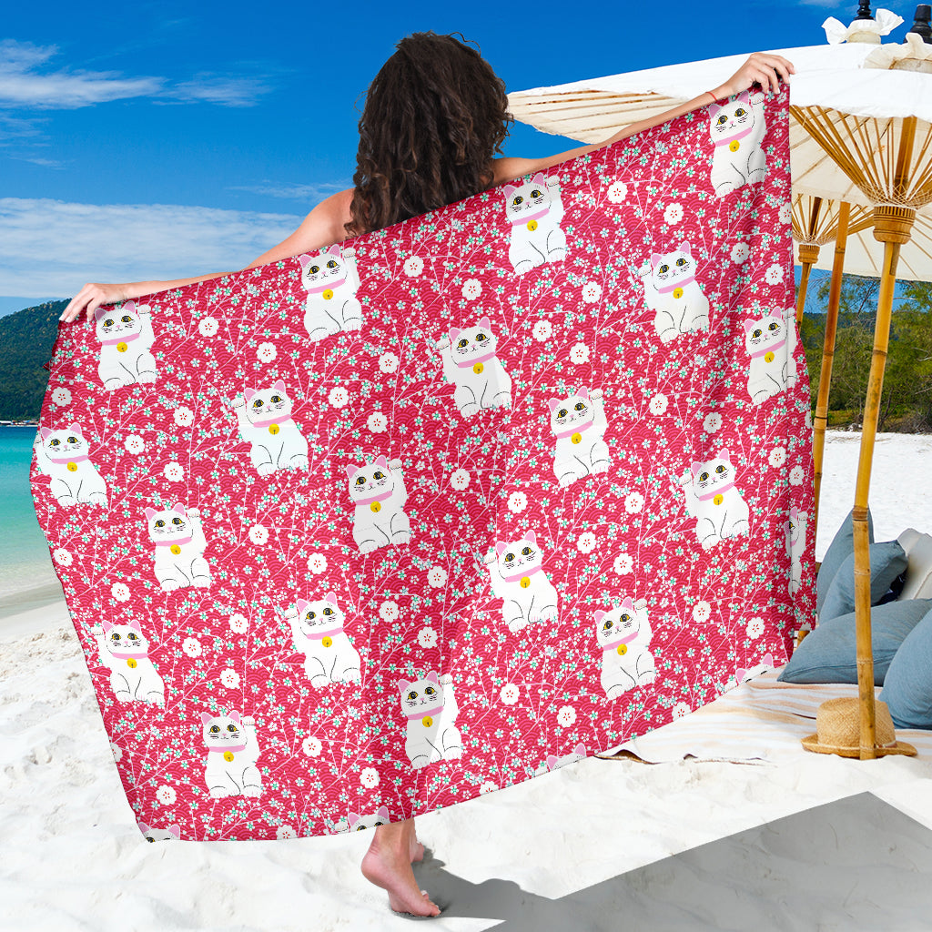 Maneki Neko Lucky Cat Sakura Pink Background Sarong