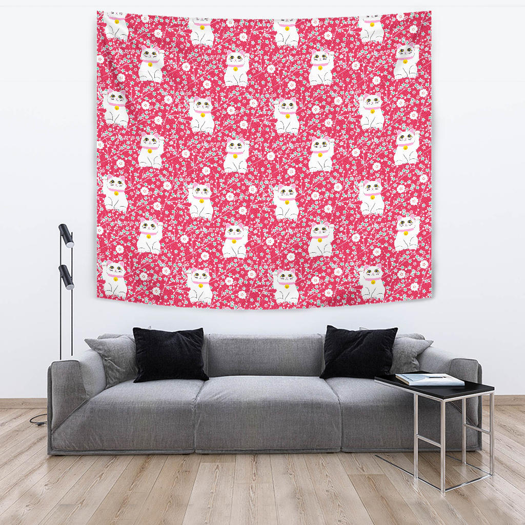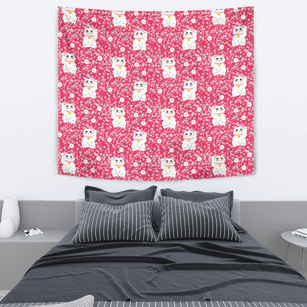 Maneki Neko Lucky Cat Sakura Pink Background Wall Tapestry