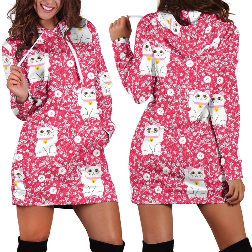 Maneki Neko Lucky Cat Sakura Pink Background Women'S Hoodie Dress