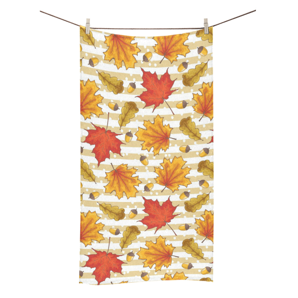 Maple leaf oak leaf acorns beige striped backgroun Bath Towel 30"x56" is a uniqued design and limited item. It made to order, hand printed, and sewn with love in our factory.