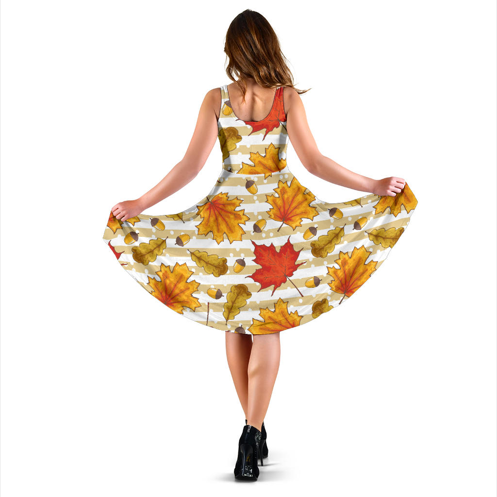 Maple Leaf Oak Leaf Acorns Beige Striped Background Sleeveless Midi Dress