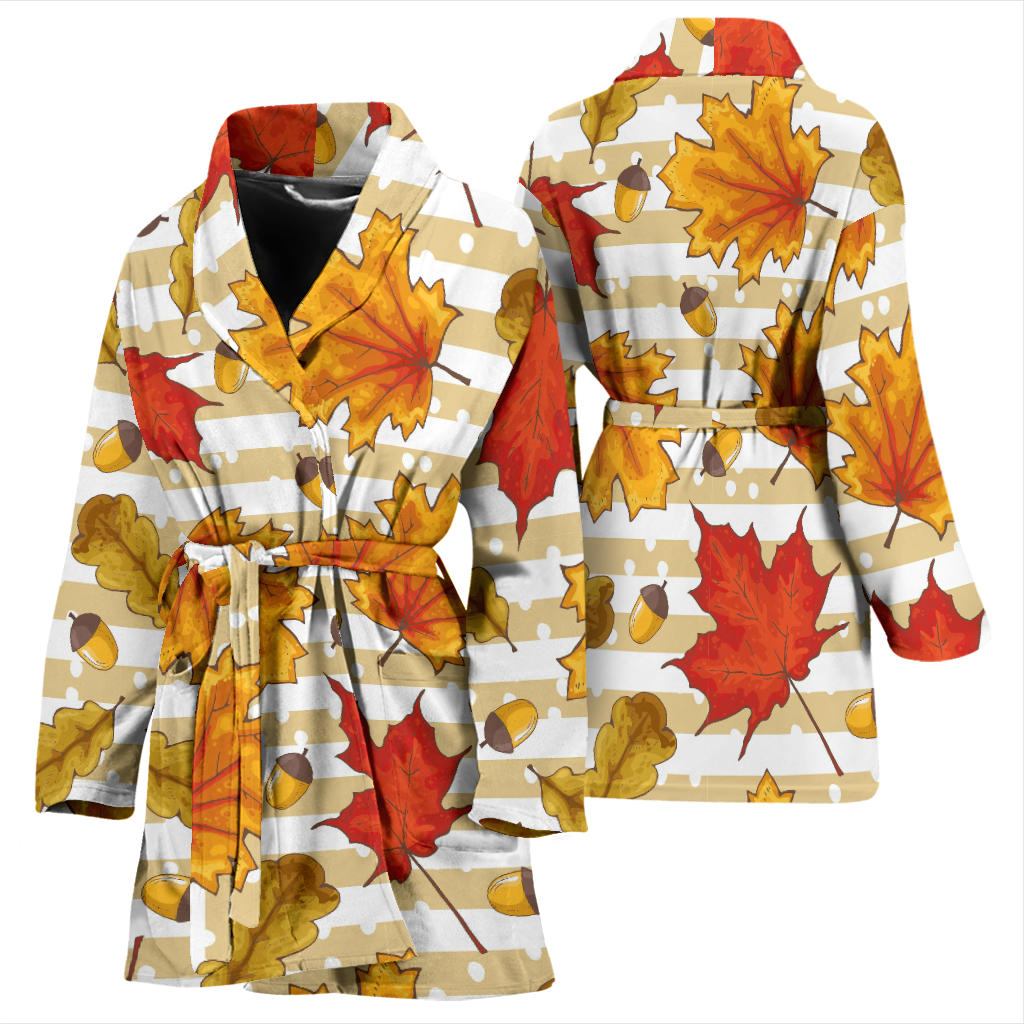 Maple Leaf Oak Leaf Acorns Beige Striped Background Women'S Bathrobe